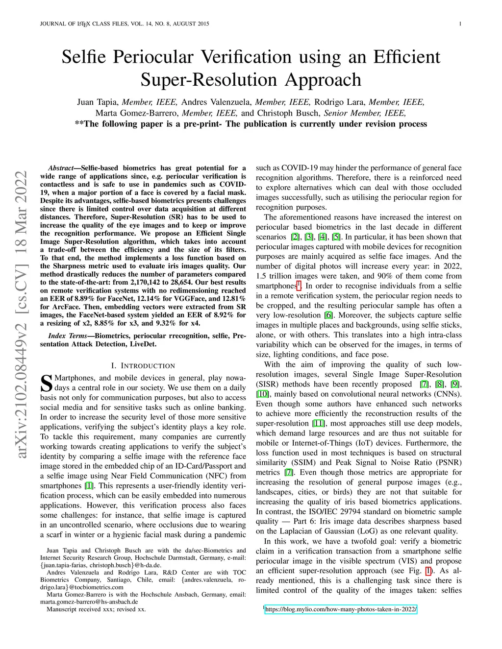 Selfie Periocular Verification using an Efficient Super-Resolution