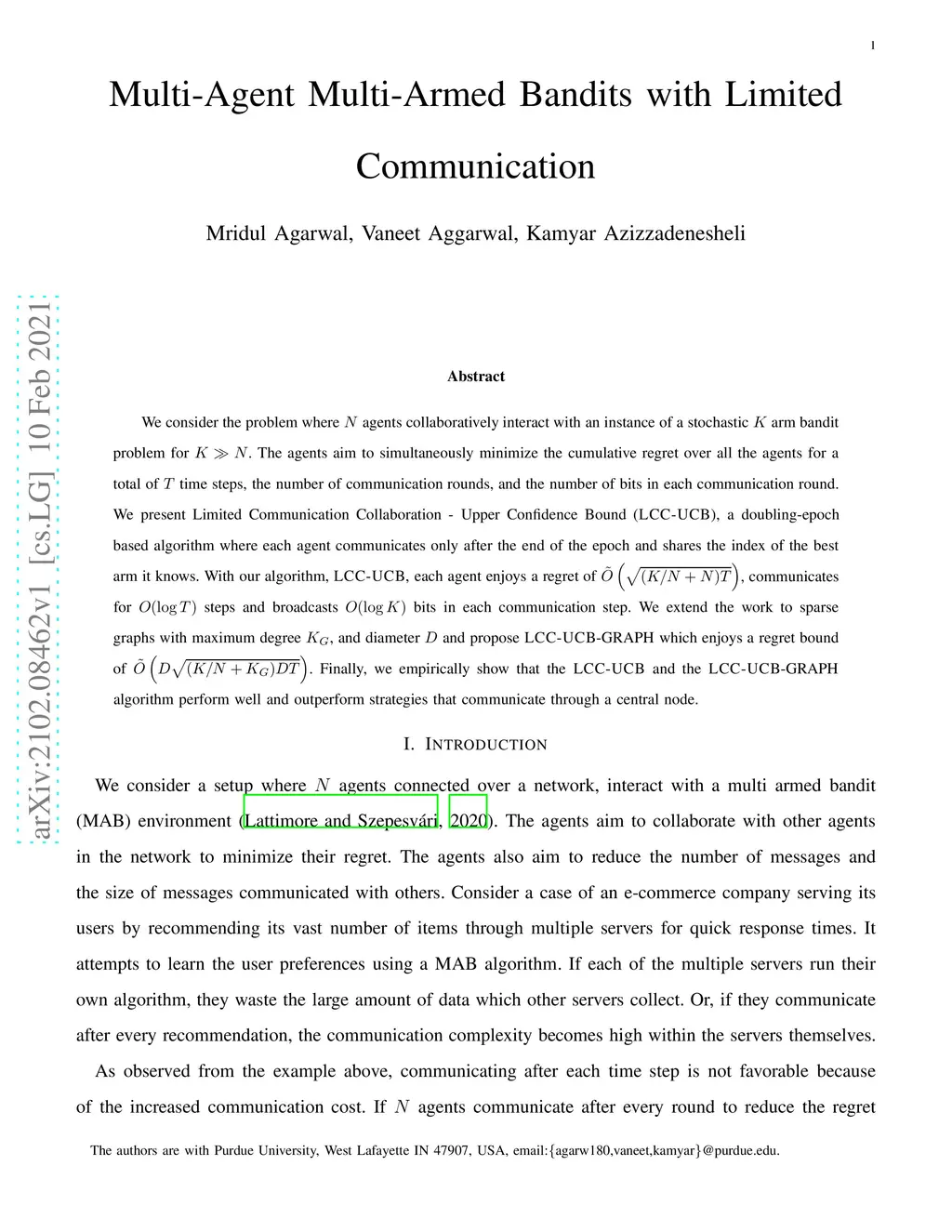 We consider the problem where agents collaboratively interact with an instance of a stochastic arm bandit problem for . The agents aim to simultaneously minimize the cumulative regret over all the agents for a total of time steps, the number of communication rounds, and the number of bits in each communication round. We present Limited Communication Collaboration - Upper Confidence Bound (LCC-UCB), a doubling-epoch based algorithm where each agent communicates only after the end of the epoch and shares the index of the best arm it knows. With our algorithm, LCC-UCB, each agent enjoys a regret of , communicates for steps and broadcasts bits in each communication step. We extend the work to sparse graphs with maximum degree , and diameter and propose LCC-UCB-GRAPH which enjoys a regret bound of . Finally, we empirically show that the LCC-UCB and the LCC-UCB-GRAPH algorithm perform well and outperform strategies that communicate through a central node