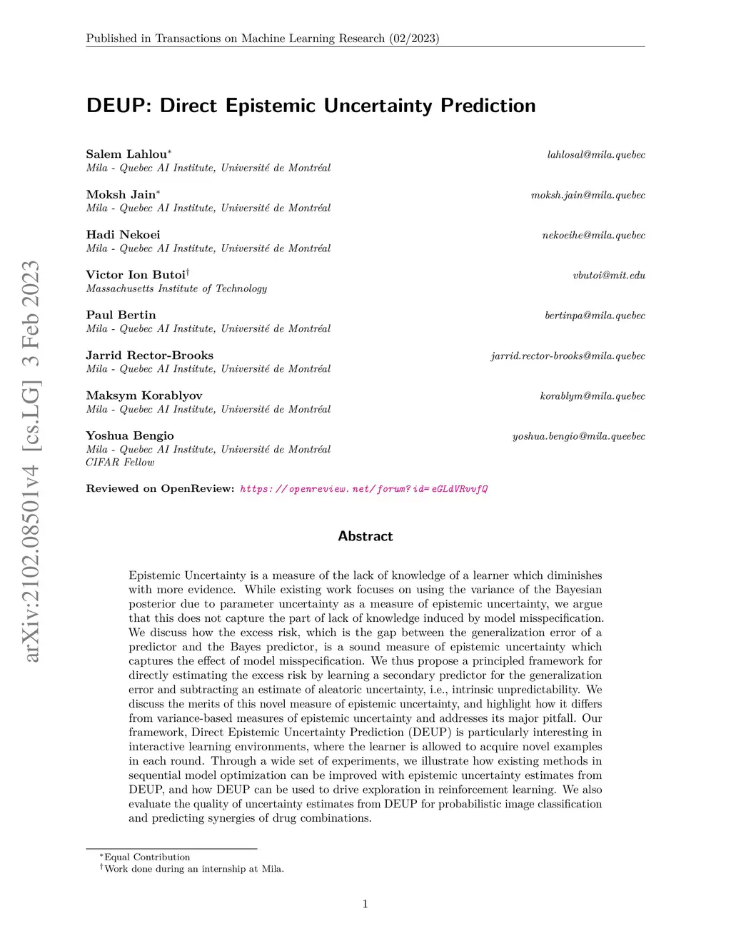 Epistemic Uncertainty is a measure of the lack of knowledge of a learner which diminishes with more evidence. While existing work focuses on using the variance of the Bayesian posterior due to parameter uncertainty as a measure of epistemic uncertainty, we argue that this does not capture the part of lack of knowledge induced by model misspecification. We discuss how the excess risk, which is the gap between the generalization error of a predictor and the Bayes predictor, is a sound measure of epistemic uncertainty which captures the effect of model misspecification. We thus propose a principled framework for directly estimating the excess risk by learning a secondary predictor for the generalization error and subtracting an estimate of aleatoric uncertainty, i.e., intrinsic unpredictability. We discuss the merits of this novel measure of epistemic uncertainty, and highlight how it differs from variance-based measures of epistemic uncertainty and addresses its major pitfall. Our framework, Direct Epistemic Uncertainty Prediction (DEUP) is particularly interesting in interactive learning environments, where the learner is allowed to acquire novel examples in each round. Through a wide set of experiments, we illustrate how existing methods in sequential model optimization can be improved with epistemic uncertainty estimates from DEUP, and how DEUP can be used to drive exploration in reinforcement learning. We also evaluate the quality of uncertainty estimates from DEUP for probabilistic image classification and predicting synergies of drug combinations.
