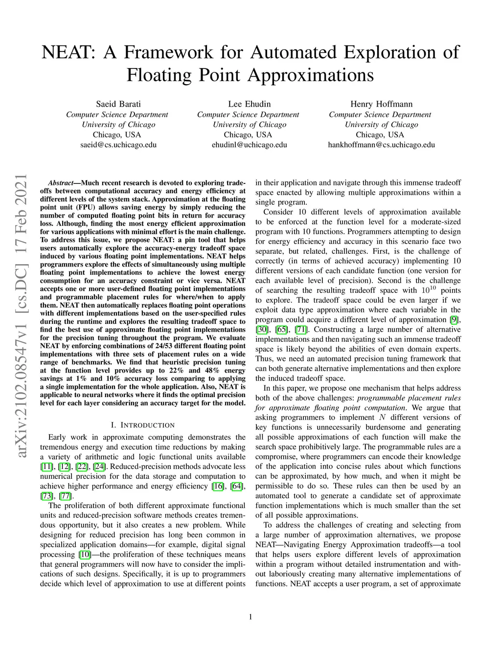 Much recent research is devoted to exploring tradeoffs between computational accuracy and energy efficiency at different levels of the system stack. Approximation at the floating point unit (FPU) allows saving energy by simply reducing the number of computed floating point bits in return for accuracy loss. Although, finding the most energy efficient approximation for various applications with minimal effort is the main challenge. To address this issue, we propose NEAT: a pin tool that helps users automatically explore the accuracy-energy tradeoff space induced by various floating point implementations. NEAT helps programmers explore the effects of simultaneously using multiple floating point implementations to achieve the lowest energy consumption for an accuracy constraint or vice versa. NEAT accepts one or more user-defined floating point implementations and programmable placement rules for where/when to apply them. NEAT then automatically replaces floating point operations with different implementations based on the user-specified rules during the runtime and explores the resulting tradeoff space to find the best use of approximate floating point implementations for the precision tuning throughout the program. We evaluate NEAT by enforcing combinations of 24/53 different floating point implementations with three sets of placement rules on a wide range of benchmarks. We find that heuristic precision tuning at the function level provides up to 22% and 48% energy savings at 1% and 10% accuracy loss comparing to applying a single implementation for the whole application. Also, NEAT is applicable to neural networks where it finds the optimal precision level for each layer considering an accuracy target for the model.