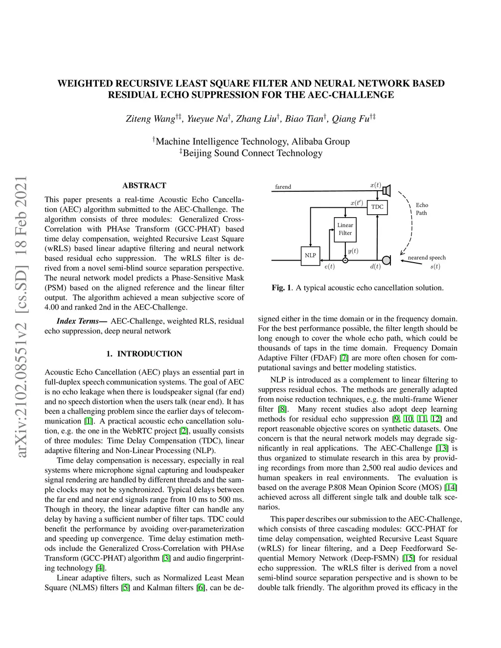 This paper presents a real-time Acoustic Echo Cancellation (AEC) algorithm submitted to the AEC-Challenge. The algorithm consists of three modules: Generalized Cross-Correlation with PHAse Transform (GCC-PHAT) based time delay compensation, weighted Recursive Least Square (wRLS) based linear adaptive filtering and neural network based residual echo suppression. The wRLS filter is derived from a novel semi-blind source separation perspective. The neural network model predicts a Phase-Sensitive Mask (PSM) based on the aligned reference and the linear filter output. The algorithm achieved a mean subjective score of 4.00 and ranked 2nd in the AEC-Challenge.