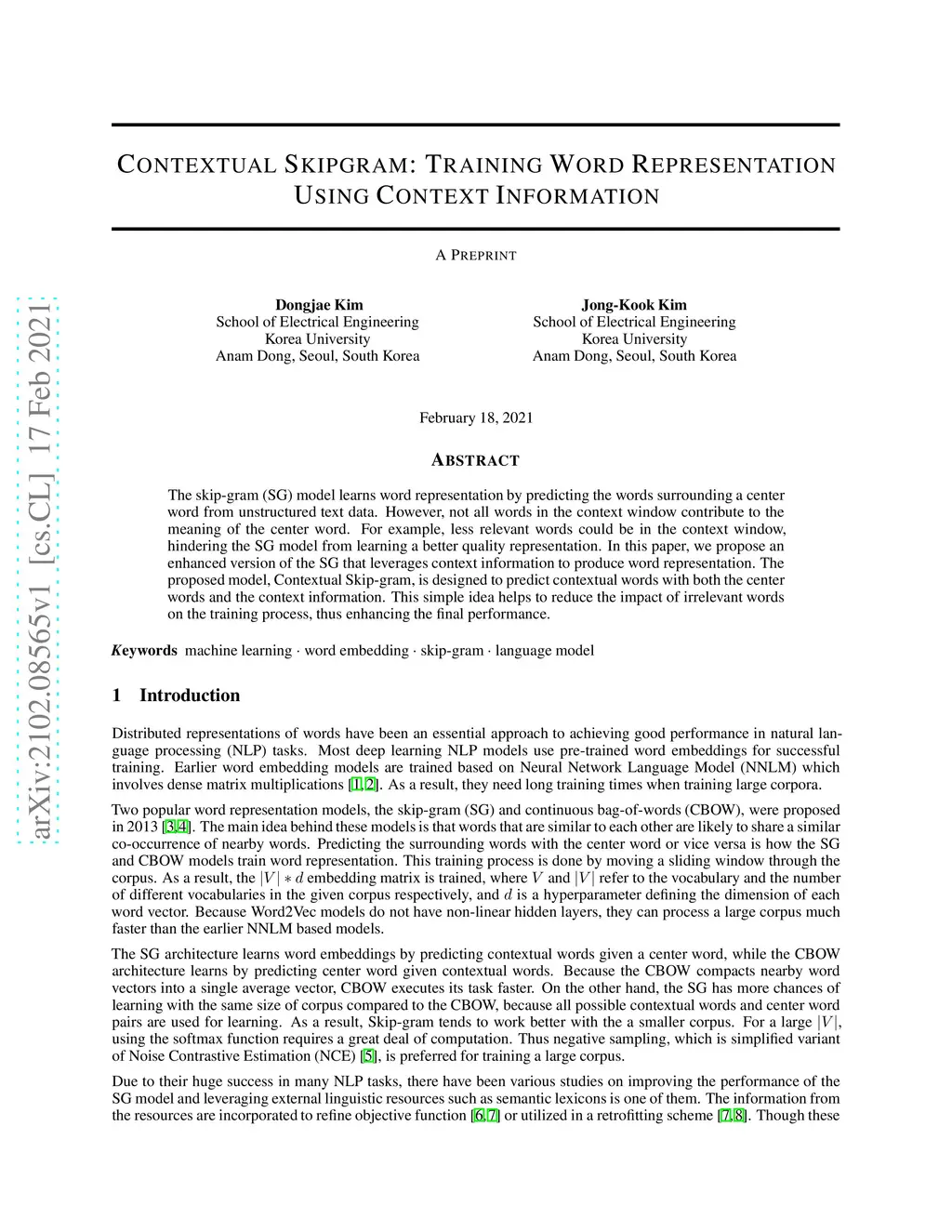 The skip-gram (SG) model learns word representation by predicting the words surrounding a center word from unstructured text data. However, not all words in the context window contribute to the meaning of the center word. For example, less relevant words could be in the context window, hindering the SG model from learning a better quality representation. In this paper, we propose an enhanced version of the SG that leverages context information to produce word representation. The proposed model, Contextual Skip-gram, is designed to predict contextual words with both the center words and the context information. This simple idea helps to reduce the impact of irrelevant words on the training process, thus enhancing the final performance