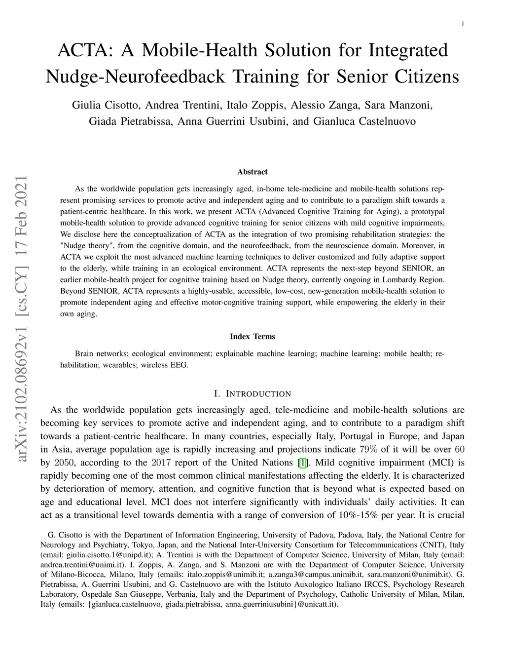 As the worldwide population gets increasingly aged, in-home telemedicine and mobile-health solutions represent promising services to promote active and independent aging and to contribute to a paradigm shift towards patient-centric healthcare. In this work, we present ACTA (Advanced Cognitive Training for Aging), a prototype mobile-health solution to provide advanced cognitive training for senior citizens with mild cognitive impairments. We disclose here the conceptualization of ACTA as the integration of two promising rehabilitation strategies: the "Nudge theory", from the cognitive domain, and the neurofeedback, from the neuroscience domain. Moreover, in ACTA we exploit the most advanced machine learning techniques to deliver customized and fully adaptive support to the elderly, while training in an ecological environment. ACTA represents the next-step beyond SENIOR, an earlier mobile-health project for cognitive training based on Nudge theory, currently ongoing in Lombardy Region. Beyond SENIOR, ACTA represents a highly-usable, accessible, low-cost, new-generation mobile-health solution to promote independent aging and effective motor-cognitive training support, while empowering the elderly in their own aging.