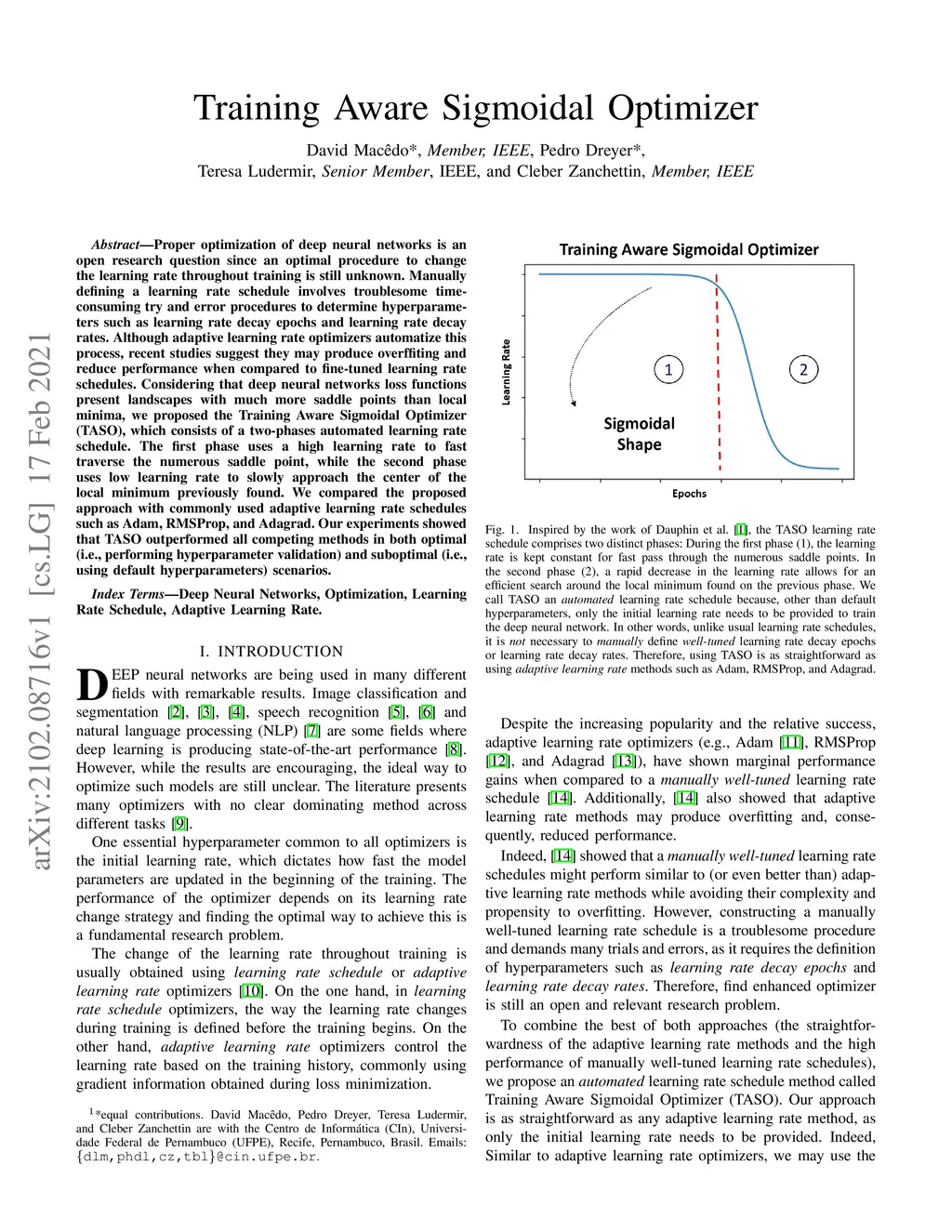 Proper optimization of deep neural networks is an open research question since an optimal procedure to change the learning rate throughout training is still unknown. Manually defining a learning rate schedule involves troublesome time-consuming try and error procedures to determine hyperparameters such as learning rate decay epochs and learning rate decay rates. Although adaptive learning rate optimizers automatize this process, recent studies suggest they may produce overffiting and reduce performance when compared to fine-tuned learning rate schedules. Considering that deep neural networks loss functions present landscapes with much more saddle points than local minima, we proposed the Training Aware Sigmoidal Optimizer (TASO), which consists of a two-phases automated learning rate schedule. The first phase uses a high learning rate to fast traverse the numerous saddle point, while the second phase uses low learning rate to slowly approach the center of the local minimum previously found. We compared the proposed approach with commonly used adaptive learning rate schedules such as Adam, RMSProp, and Adagrad. Our experiments showed that TASO outperformed all competing methods in both optimal (i.e., performing hyperparameter validation) and suboptimal (i.e., using default hyperparameters) scenarios.