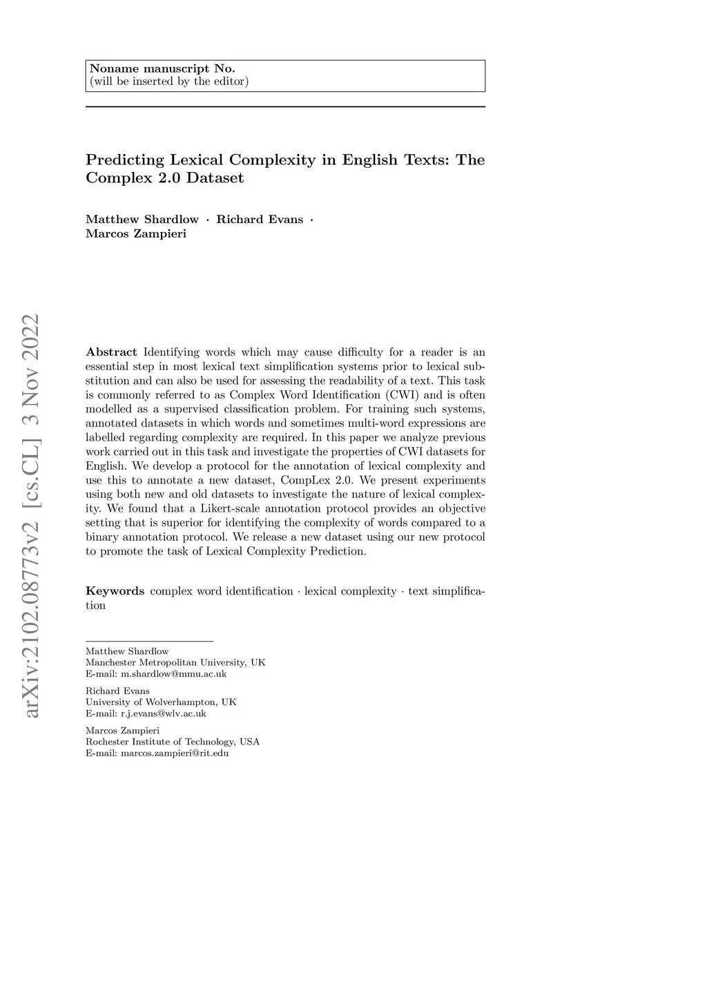 Predicting Lexical Complexity in English Texts: The Complex 2.0 Dataset
