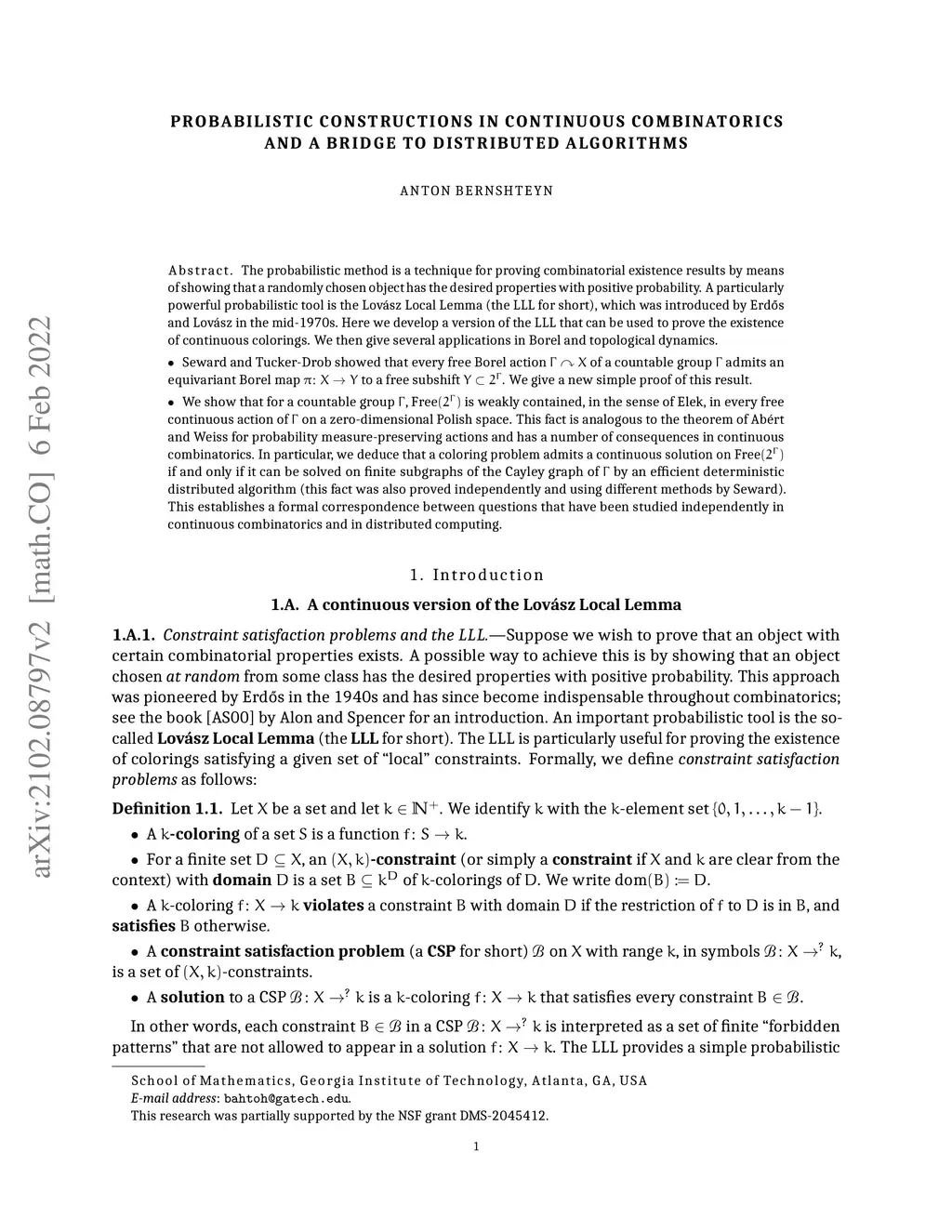 The probabilistic method is a technique for proving combinatorial existence results by means of showing that a randomly chosen object has the desired properties with positive probability. A particularly powerful probabilistic tool is the Lov\'{a}sz Local Lemma (the LLL for short), which was introduced by Erd\H{o}s and Lov\'{a}sz in the mid-1970s. Here we develop a version of the LLL that can be used to prove the existence of continuous colorings. We then give several applications in Borel and topological dynamics. * Seward and Tucker-Drob showed that every free Borel action of a countable group admits an equivariant Borel map to a free subshift . We give a new simple proof of this result. * We show that for a countable group , is weakly contained, in the sense of Elek, in every free continuous action of on a zero-dimensional Polish space. This fact is analogous to the theorem of Ab\'{e}rt and Weiss for probability measure-preserving actions and has a number of consequences in continuous combinatorics. In particular, we deduce that a coloring problem admits a continuous solution on if and only if it can be solved on finite subgraphs of the Cayley graph of by an efficient deterministic distributed algorithm (this fact was also proved independently and using different methods by Seward). This establishes a formal correspondence between questions that have been studied independently in continuous combinatorics and in distributed computing.