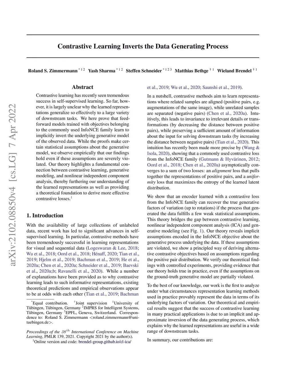 Contrastive learning has recently seen tremendous success in self-supervised learning. So far, however, it is largely unclear why the learned representations generalize so effectively to a large variety of downstream tasks. We here prove that feedforward models trained with objectives belonging to the commonly used InfoNCE family learn to implicitly invert the underlying generative model of the observed data. While the proofs make certain statistical assumptions about the generative model, we observe empirically that our findings hold even if these assumptions are severely violated. Our theory highlights a fundamental connection between contrastive learning, generative modeling, and nonlinear independent component analysis, thereby furthering our understanding of the learned representations as well as providing a theoretical foundation to derive more effective contrastive losses.
