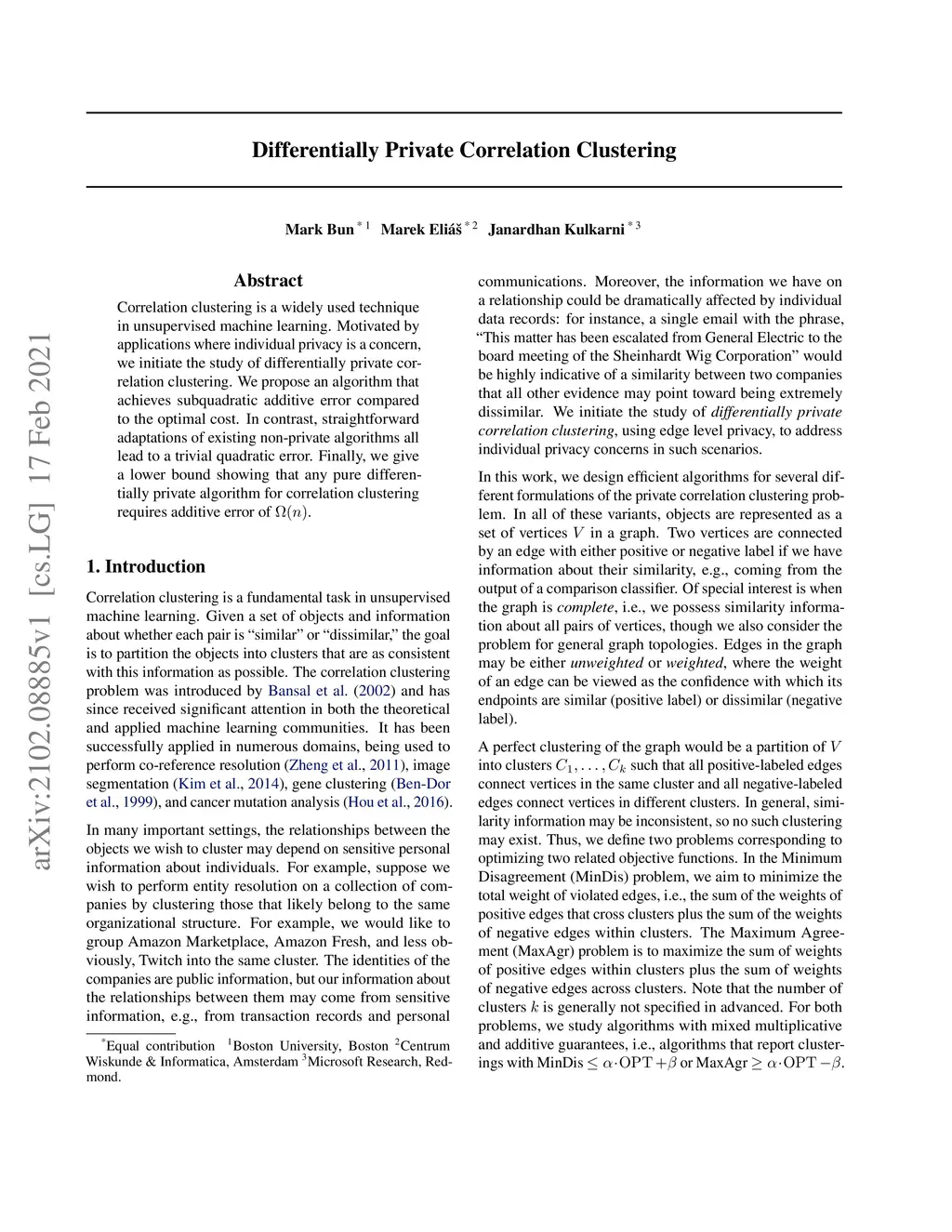 Correlation clustering is a widely used technique in unsupervised machine learning. Motivated by applications where individual privacy is a concern, we initiate the study of differentially private correlation clustering. We propose an algorithm that achieves subquadratic additive error compared to the optimal cost. In contrast, straightforward adaptations of existing non-private algorithms all lead to a trivial quadratic error. Finally, we give a lower bound showing that any pure differentially private algorithm for correlation clustering requires additive error of .