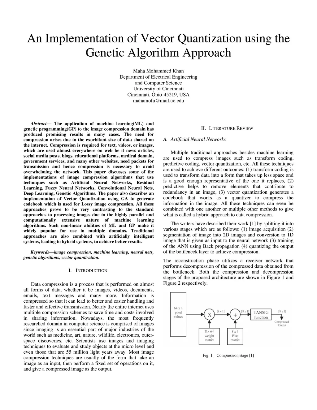 The application of machine learning(ML) and genetic programming(GP) to the image compression domain has produced promising results in many cases. The need for compression arises due to the exorbitant size of data shared on the internet. Compression is required for text, videos, or images, which are used almost everywhere on web be it news articles, social media posts, blogs, educational platforms, medical domain, government services, and many other websites, need packets for transmission and hence compression is necessary to avoid overwhelming the network. This paper discusses some of the implementations of image compression algorithms that use techniques such as Artificial Neural Networks, Residual Learning, Fuzzy Neural Networks, Convolutional Neural Nets, Deep Learning, Genetic Algorithms. The paper also describes an implementation of Vector Quantization using GA to generate codebook which is used for Lossy image compression. All these approaches prove to be very contrasting to the standard approaches to processing images due to the highly parallel and computationally extensive nature of machine learning algorithms. Such non-linear abilities of ML and GP make it widely popular for use in multiple domains. Traditional approaches are also combined with artificially intelligent systems, leading to hybrid systems, to achieve better results.