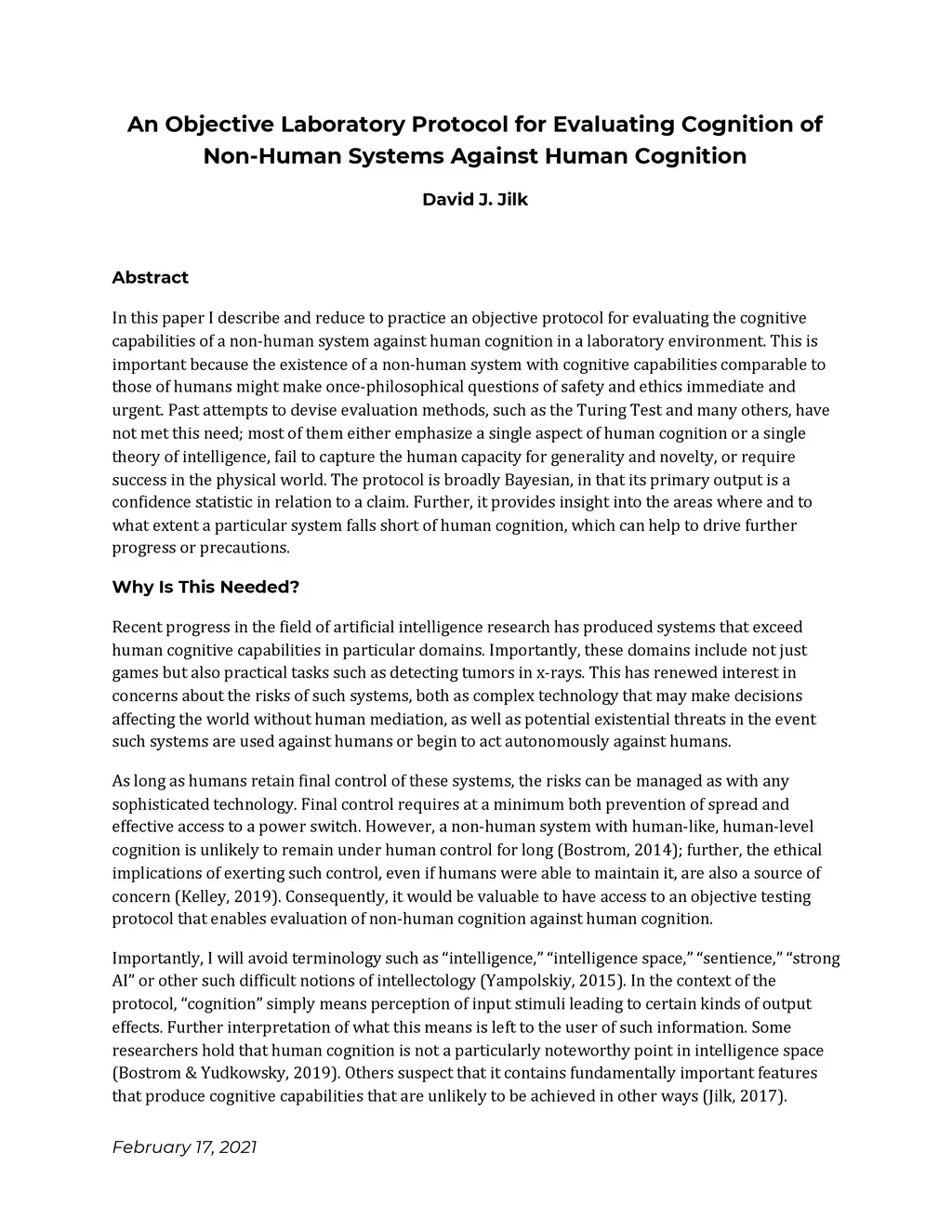 In this paper I describe and reduce to practice an objective protocol for evaluating the cognitive capabilities of a non-human system against human cognition in a laboratory environment. This is important because the existence of a non-human system with cognitive capabilities comparable to those of humans might make once-philosophical questions of safety and ethics immediate and urgent. Past attempts to devise evaluation methods, such as the Turing Test and many others, have not met this need; most of them either emphasize a single aspect of human cognition or a single theory of intelligence, fail to capture the human capacity for generality and novelty, or require success in the physical world. The protocol is broadly Bayesian, in that its primary output is a confidence statistic in relation to a claim. Further, it provides insight into the areas where and to what extent a particular system falls short of human cognition, which can help to drive further progress or precautions.