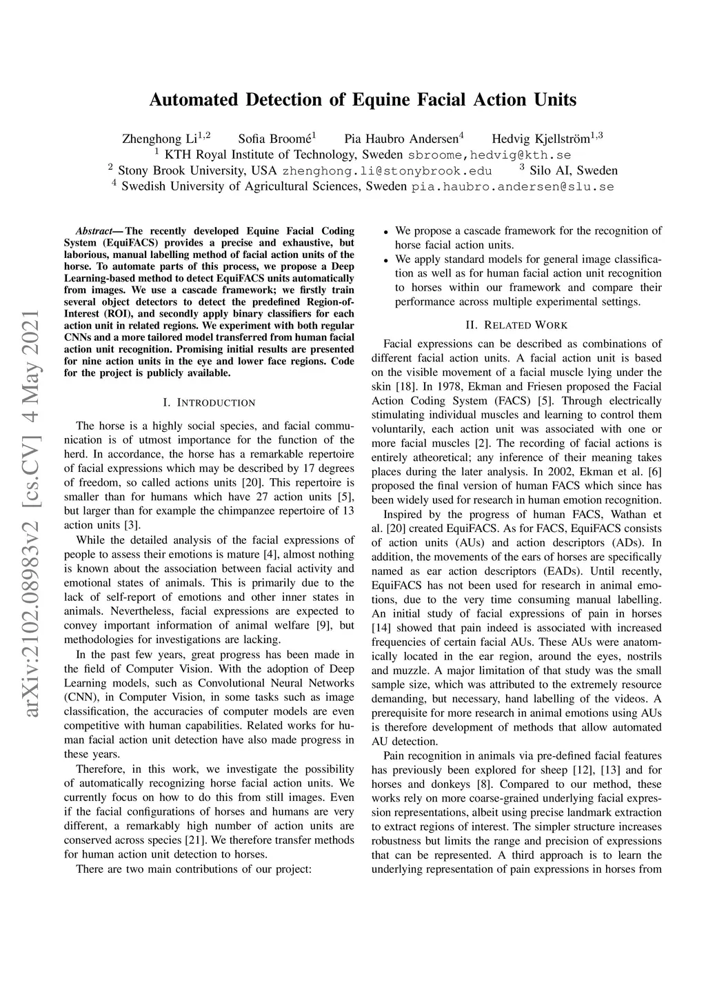 The recently developed Equine Facial Action Coding System (EquiFACS) provides a precise and exhaustive, but laborious, manual labelling method of facial action units of the horse. To automate parts of this process, we propose a Deep Learning-based method to detect EquiFACS units automatically from images. We use a cascade framework; we firstly train several object detectors to detect the predefined Region-of-Interest (ROI), and secondly apply binary classifiers for each action unit in related regions. We experiment with both regular CNNs and a more tailored model transferred from human facial action unit recognition. Promising initial results are presented for nine action units in the eye and lower face regions. Code for the project is publicly available.