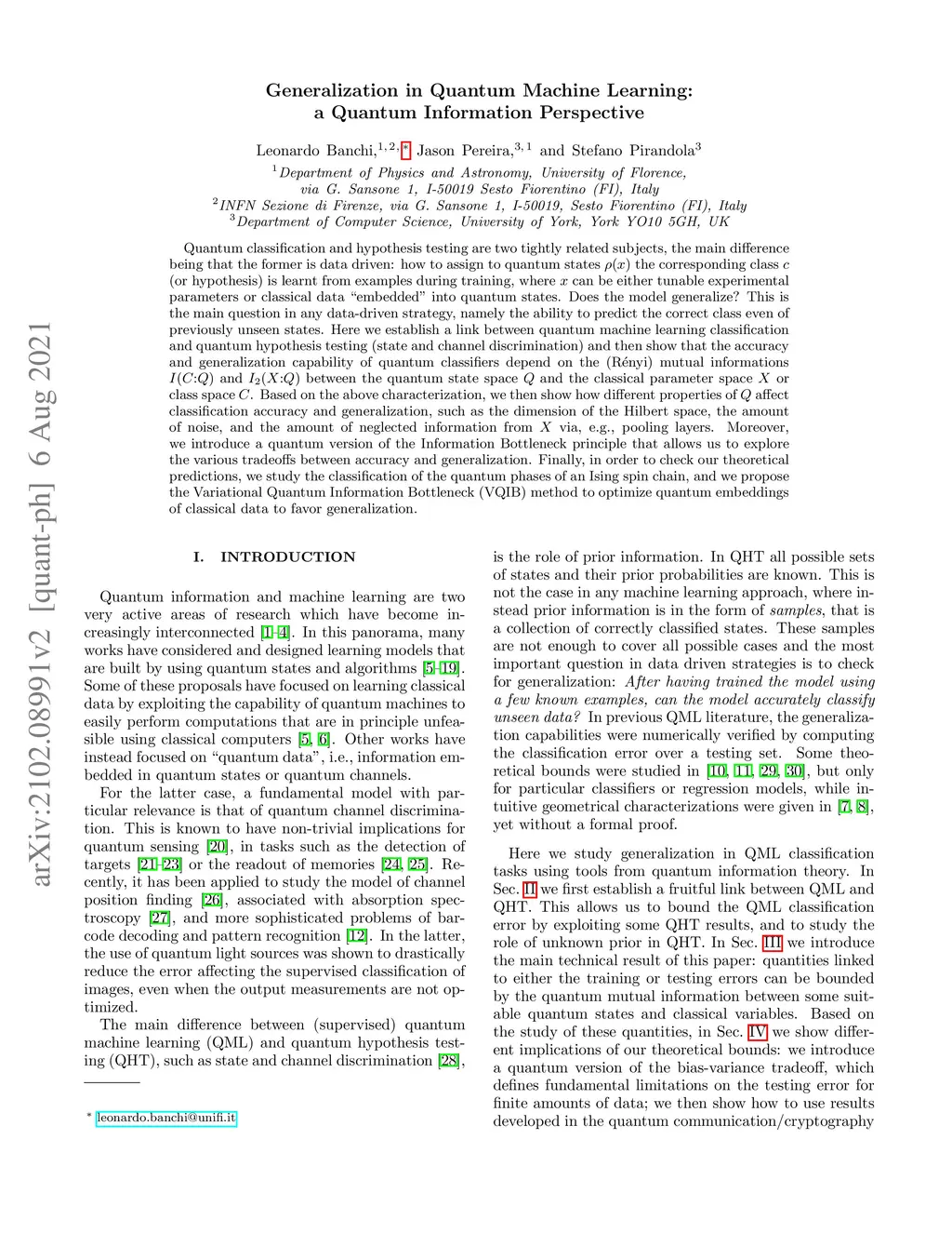 Quantum classification and hypothesis testing are two tightly related subjects, the main difference being that the former is data driven: how to assign to quantum states the corresponding class (or hypothesis) is learnt from examples during training, where can be either tunable experimental parameters or classical data "embedded" into quantum states. Does the model generalize? This is the main question in any data-driven strategy, namely the ability to predict the correct class even of previously unseen states. Here we establish a link between quantum machine learning classification and quantum hypothesis testing (state and channel discrimination) and then show that the accuracy and generalization capability of quantum classifiers depend on the (R\ényi) mutual informations and between the quantum state space and the classical parameter space or class space . Based on the above characterization, we then show how different properties of affect classification accuracy and generalization, such as the dimension of the Hilbert space, the amount of noise, and the amount of neglected information from via, e.g., pooling layers. Moreover, we introduce a quantum version of the Information Bottleneck principle that allows us to explore the various tradeoffs between accuracy and generalization. Finally, in order to check our theoretical predictions, we study the classification of the quantum phases of an Ising spin chain, and we propose the Variational Quantum Information Bottleneck (VQIB) method to optimize quantum embeddings of classical data to favor generalization.
