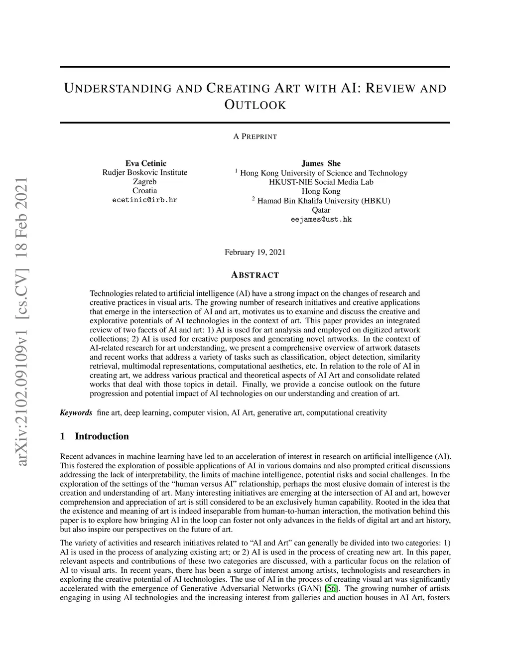 Technologies related to artificial intelligence (AI) have a strong impact on the changes of research and creative practices in visual arts. The growing number of research initiatives and creative applications that emerge in the intersection of AI and art, motivates us to examine and discuss the creative and explorative potentials of AI technologies in the context of art. This paper provides an integrated review of two facets of AI and art: 1) AI is used for art analysis and employed on digitized artwork collections; 2) AI is used for creative purposes and generating novel artworks. In the context of AI-related research for art understanding, we present a comprehensive overview of artwork datasets and recent works that address a variety of tasks such as classification, object detection, similarity retrieval, multimodal representations, computational aesthetics, etc. In relation to the role of AI in creating art, we address various practical and theoretical aspects of AI Art and consolidate related works that deal with those topics in detail. Finally, we provide a concise outlook on the future progression and potential impact of AI technologies on our understanding and creation of art.