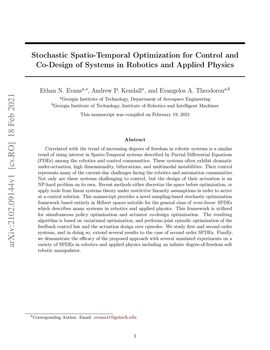 Correlated with the trend of increasing degrees of freedom in robotic systems is a similar trend of rising interest in Spatio-Temporal systems described by Partial Differential Equations (PDEs) among the robotics and control communities. These systems often exhibit dramatic under-actuation, high dimensionality, bifurcations, and multimodal instabilities. Their control represents many of the current-day challenges facing the robotics and automation communities. Not only are these systems challenging to control, but the design of their actuation is an NP-hard problem on its own. Recent methods either discretize the space before optimization, or apply tools from linear systems theory under restrictive linearity assumptions in order to arrive at a control solution. This manuscript provides a novel sampling-based stochastic optimization framework based entirely in Hilbert spaces suitable for the general class of \textit{semi-linear} SPDEs which describes many systems in robotics and applied physics. This framework is utilized for simultaneous policy optimization and actuator co-design optimization. The resulting algorithm is based on variational optimization, and performs joint episodic optimization of the feedback control law and the actuation design over episodes. We study first and second order systems, and in doing so, extend several results to the case of second order SPDEs. Finally, we demonstrate the efficacy of the proposed approach with several simulated experiments on a variety of SPDEs in robotics and applied physics including an infinite degree-of-freedom soft robotic manipulator.
