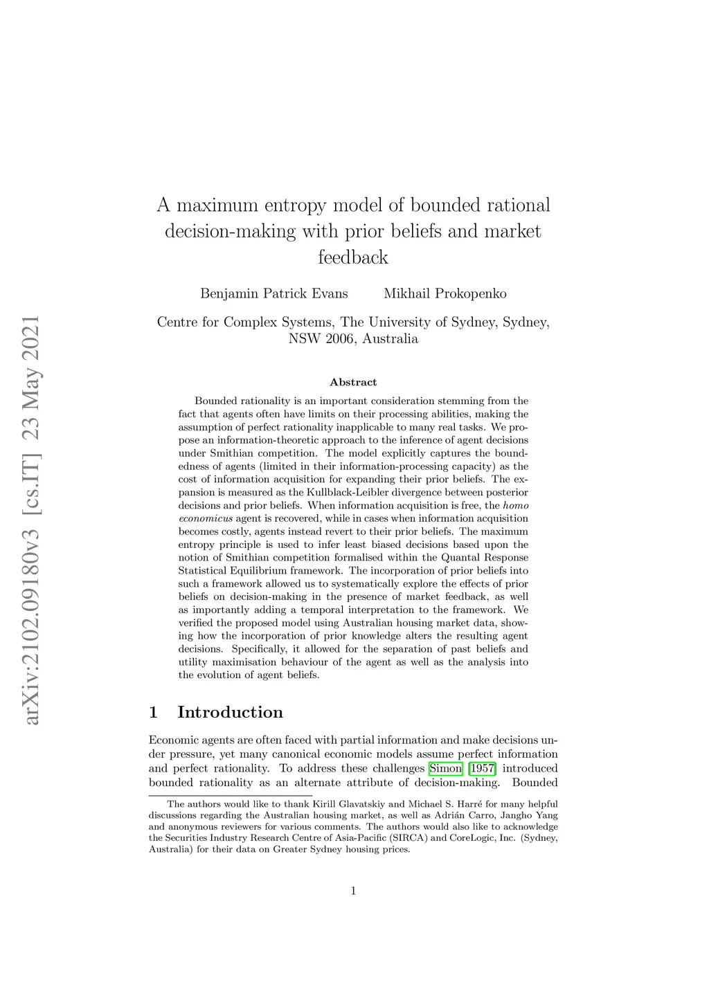 Bounded rationality is an important consideration stemming from the fact that agents often have limits on their processing abilities, making the assumption of perfect rationality inapplicable to many real tasks. We propose an information-theoretic approach to the inference of agent decisions under Smithian competition. The model explicitly captures the boundedness of agents (limited in their information-processing capacity) as the cost of information acquisition for expanding their prior beliefs. The expansion is measured as the Kullblack-Leibler divergence between posterior decisions and prior beliefs. When information acquisition is free, the homo economicus agent is recovered, while in cases when information acquisition becomes costly, agents instead revert to their prior beliefs. The maximum entropy principle is used to infer least-biased decisions based upon the notion of Smithian competition formalised within the Quantal Response Statistical Equilibrium framework. The incorporation of prior beliefs into such a framework allowed us to systematically explore the effects of prior beliefs on decision-making in the presence of market feedback, as well as importantly adding a temporal interpretation to the framework. We verified the proposed model using Australian housing market data, showing how the incorporation of prior knowledge alters the resulting agent decisions. Specifically, it allowed for the separation of past beliefs and utility maximisation behaviour of the agent as well as the analysis into the evolution of agent beliefs.