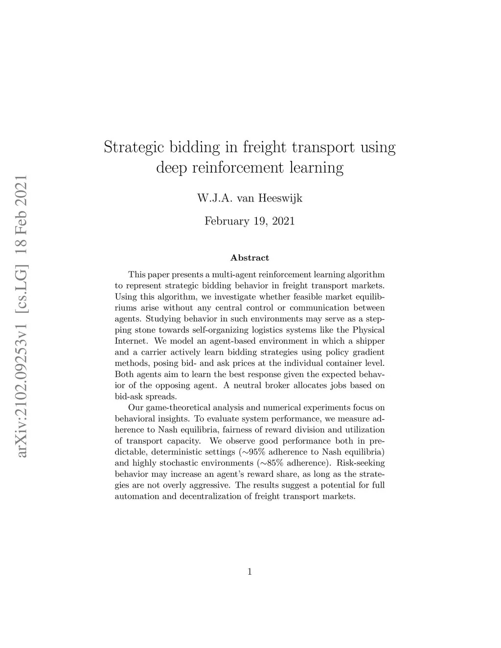 This paper presents a multi-agent reinforcement learning algorithm to represent strategic bidding behavior in freight transport markets. Using this algorithm, we investigate whether feasible market equilibriums arise without any central control or communication between agents. Studying behavior in such environments may serve as a stepping stone towards self-organizing logistics systems like the Physical Internet. We model an agent-based environment in which a shipper and a carrier actively learn bidding strategies using policy gradient methods, posing bid- and ask prices at the individual container level. Both agents aim to learn the best response given the expected behavior of the opposing agent. A neutral broker allocates jobs based on bid-ask spreads. Our game-theoretical analysis and numerical experiments focus on behavioral insights. To evaluate system performance, we measure adherence to Nash equilibria, fairness of reward division and utilization of transport capacity. We observe good performance both in predictable, deterministic settings (~95% adherence to Nash equilibria) and highly stochastic environments (~85% adherence). Risk-seeking behavior may increase an agent's reward share, as long as the strategies are not overly aggressive. The results suggest a potential for full automation and decentralization of freight transport markets.