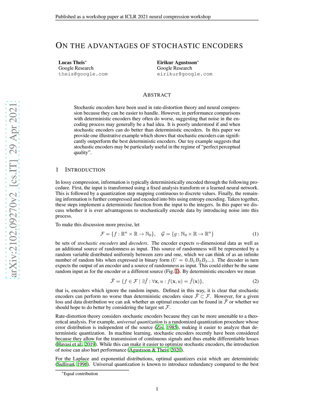 Stochastic encoders have been used in rate-distortion theory and neural compression because they can be easier to handle. However, in performance comparisons with deterministic encoders they often do worse, suggesting that noise in the encoding process may generally be a bad idea. It is poorly understood if and when stochastic encoders do better than deterministic encoders. In this paper we provide one illustrative example which shows that stochastic encoders can significantly outperform the best deterministic encoders. Our toy example suggests that stochastic encoders may be particularly useful in the regime of "perfect perceptual quality".