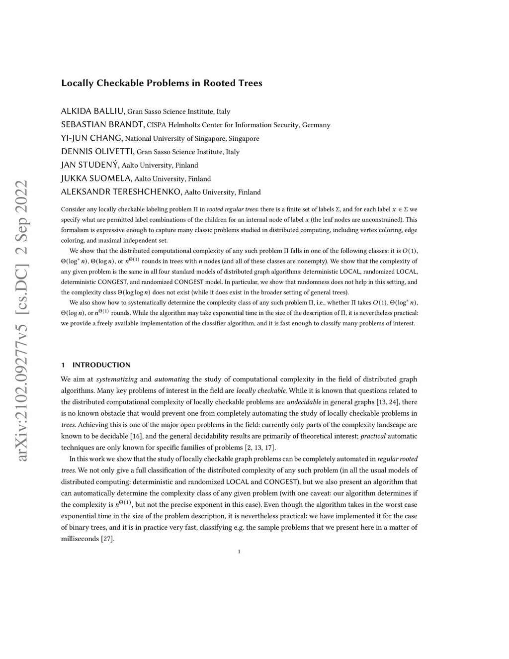 Consider any locally checkable labeling problem in rooted regular trees: there is a finite set of labels , and for each label we specify what are permitted label combinations of the children for an internal node of label (the leaf nodes are unconstrained). This formalism is expressive enough to capture many classic problems studied in distributed computing, including vertex coloring, edge coloring, and maximal independent set. We show that the distributed computational complexity of any such problem falls in one of the following classes: it is , , , or rounds in trees with nodes (and all of these classes are nonempty). We show that the complexity of any given problem is the same in all four standard models of distributed graph algorithms: deterministic LOCAL, randomized LOCAL, deterministic CONGEST, and randomized CONGEST model. In particular, we show that randomness does not help in this setting, and complexity classes such as or do not exist (while they do exist in the broader setting of general trees). We also show how to systematically determine the distributed computational complexity of any such problem . We present an algorithm that, given the description of , outputs the round complexity of in these models. While the algorithm may take exponential time in the size of the description of , it is nevertheless practical: we provide a freely available implementation of the classifier algorithm, and it is fast enough to classify many typical problems of interest.