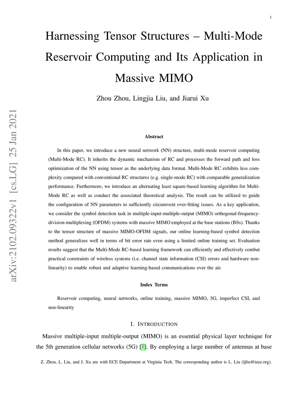 In this paper, we introduce a new neural network (NN) structure, multi-mode reservoir computing (Multi-Mode RC). It inherits the dynamic mechanism of RC and processes the forward path and loss optimization of the NN using tensor as the underlying data format. Multi-Mode RC exhibits less complexity compared with conventional RC structures (e.g. single-mode RC) with comparable generalization performance. Furthermore, we introduce an alternating least square-based learning algorithm for Multi-Mode RC as well as conduct the associated theoretical analysis. The result can be utilized to guide the configuration of NN parameters to sufficiently circumvent over-fitting issues. As a key application, we consider the symbol detection task in multiple-input-multiple-output (MIMO) orthogonal-frequency-division-multiplexing (OFDM) systems with massive MIMO employed at the base stations (BSs). Thanks to the tensor structure of massive MIMO-OFDM signals, our online learning-based symbol detection method generalizes well in terms of bit error rate even using a limited online training set. Evaluation results suggest that the Multi-Mode RC-based learning framework can efficiently and effectively combat practical constraints of wireless systems (i.e. channel state information (CSI) errors and hardware non-linearity) to enable robust and adaptive learning-based communications over the air.