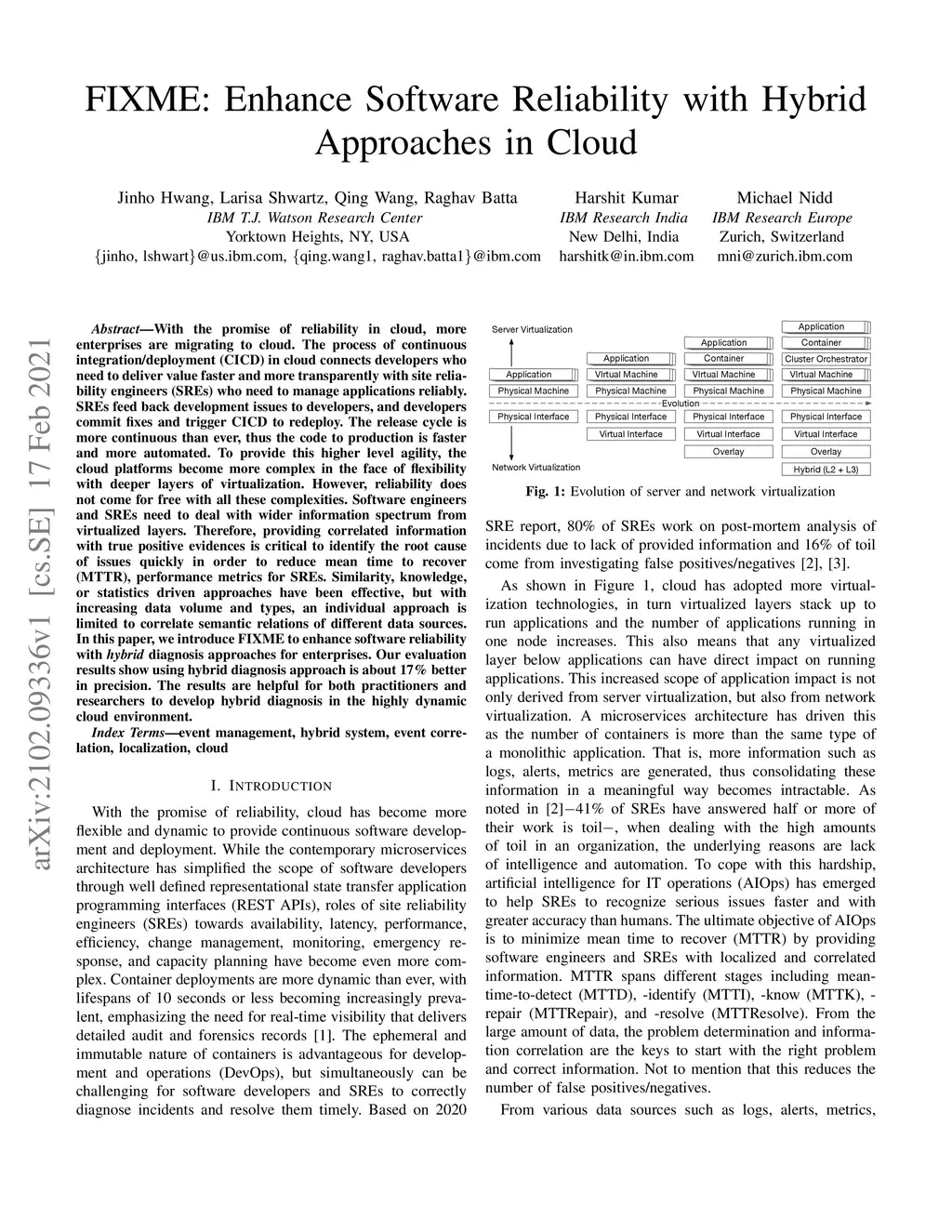 With the promise of reliability in cloud, more enterprises are migrating to cloud. The process of continuous integration/deployment (CICD) in cloud connects developers who need to deliver value faster and more transparently with site reliability engineers (SREs) who need to manage applications reliably. SREs feed back development issues to developers, and developers commit fixes and trigger CICD to redeploy. The release cycle is more continuous than ever, thus the code to production is faster and more automated. To provide this higher level agility, the cloud platforms become more complex in the face of flexibility with deeper layers of virtualization. However, reliability does not come for free with all these complexities. Software engineers and SREs need to deal with wider information spectrum from virtualized layers. Therefore, providing correlated information with true positive evidences is critical to identify the root cause of issues quickly in order to reduce mean time to recover (MTTR), performance metrics for SREs. Similarity, knowledge, or statistics driven approaches have been effective, but with increasing data volume and types, an individual approach is limited to correlate semantic relations of different data sources. In this paper, we introduce FIXME to enhance software reliability with hybrid diagnosis approaches for enterprises. Our evaluation results show using hybrid diagnosis approach is about 17% better in precision. The results are helpful for both practitioners and researchers to develop hybrid diagnosis in the highly dynamic cloud environment.