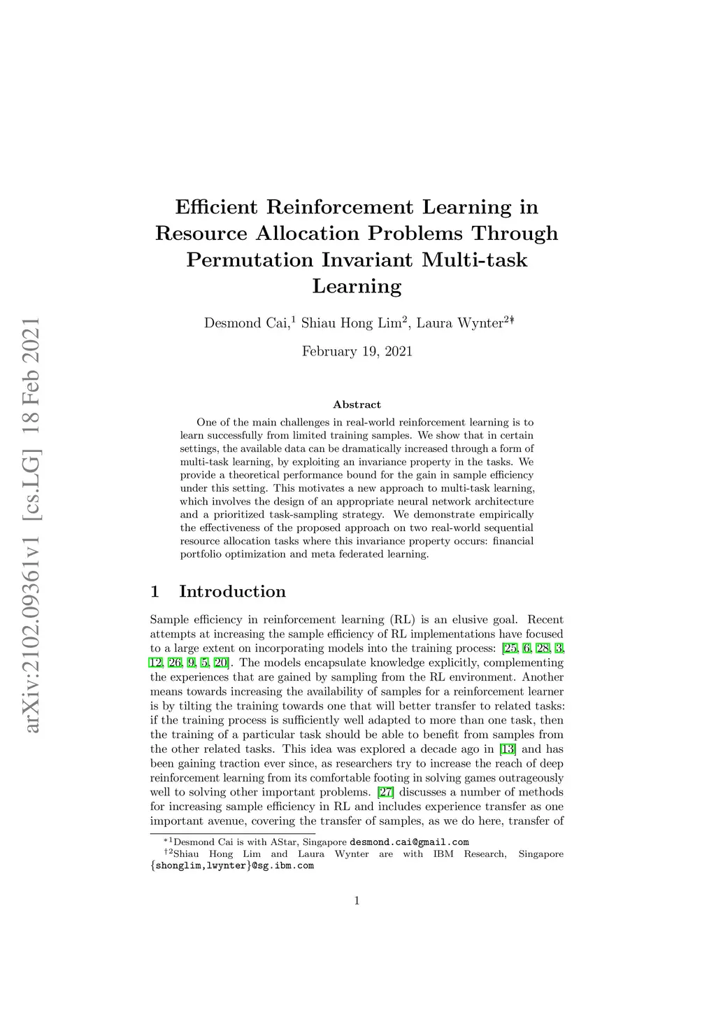 One of the main challenges in real-world reinforcement learning is to learn successfully from limited training samples. We show that in certain settings, the available data can be dramatically increased through a form of multi-task learning, by exploiting an invariance property in the tasks. We provide a theoretical performance bound for the gain in sample efficiency under this setting. This motivates a new approach to multi-task learning, which involves the design of an appropriate neural network architecture and a prioritized task-sampling strategy. We demonstrate empirically the effectiveness of the proposed approach on two real-world sequential resource allocation tasks where this invariance property occurs: financial portfolio optimization and meta federated learning.
