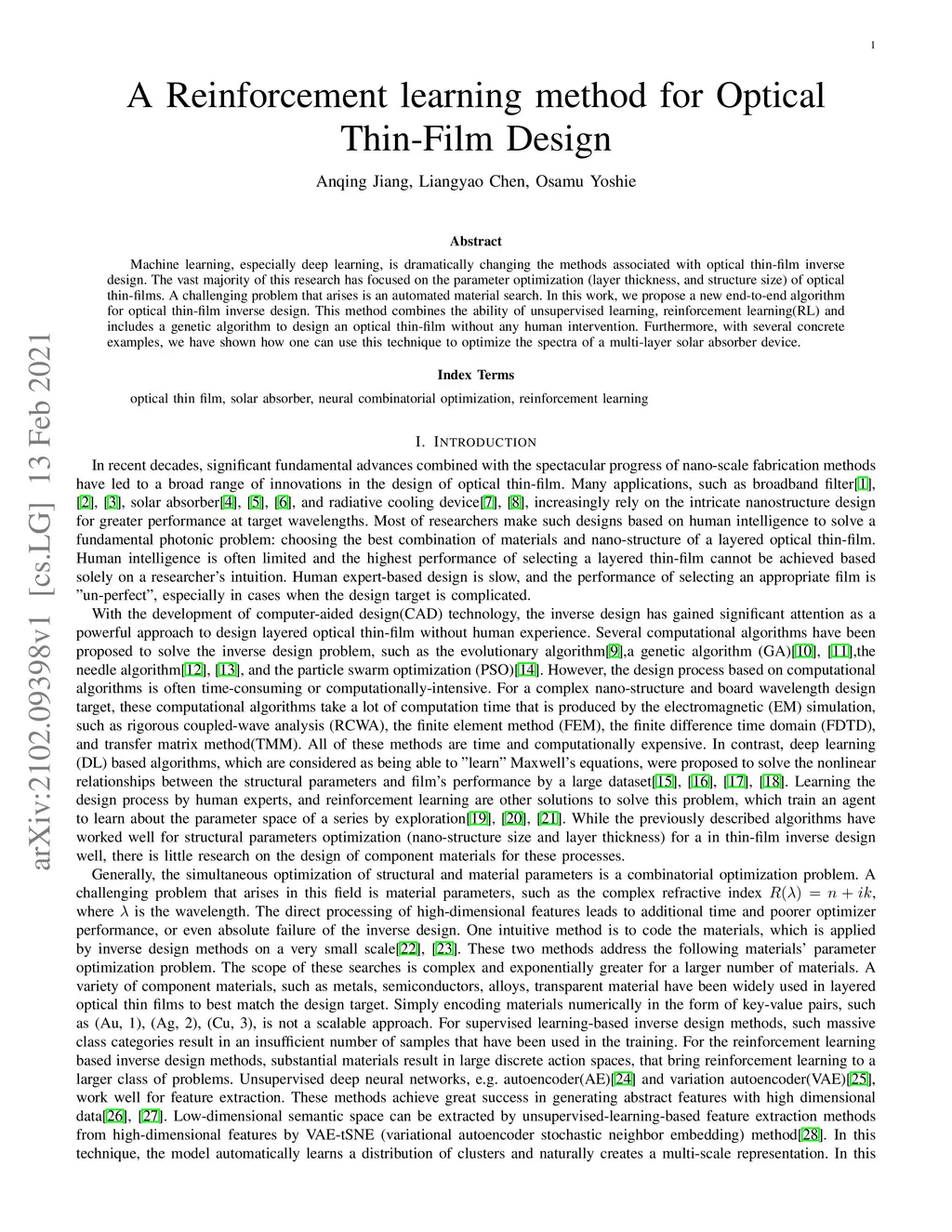 Machine learning, especially deep learning, is dramatically changing the methods associated with optical thin-film inverse design. The vast majority of this research has focused on the parameter optimization (layer thickness, and structure size) of optical thin-films. A challenging problem that arises is an automated material search. In this work, we propose a new end-to-end algorithm for optical thin-film inverse design. This method combines the ability of unsupervised learning, reinforcement learning(RL) and includes a genetic algorithm to design an optical thin-film without any human intervention. Furthermore, with several concrete examples, we have shown how one can use this technique to optimize the spectra of a multi-layer solar absorber device.