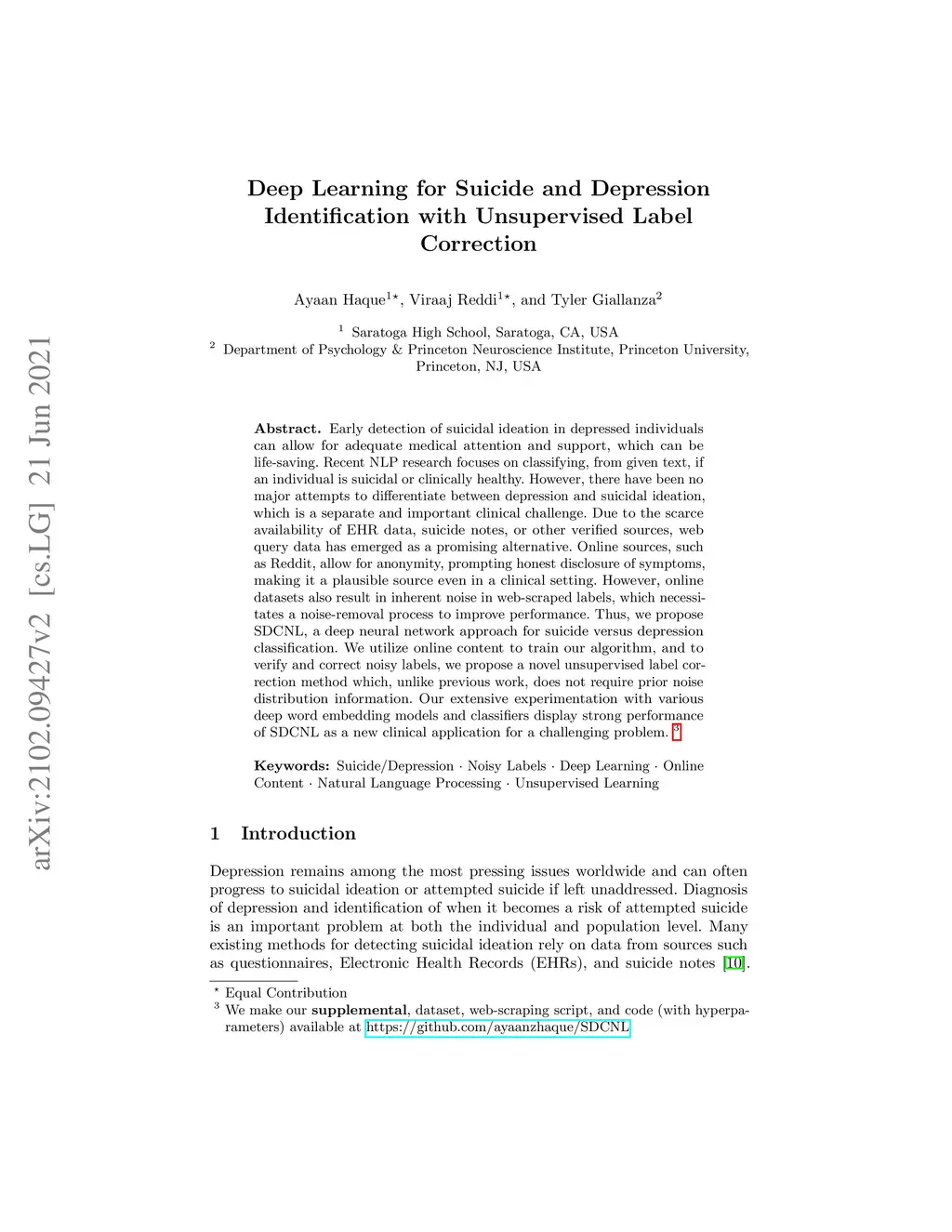 Early detection of suicidal ideation in depressed individuals can allow for adequate medical attention and support, which in many cases is life-saving. Recent NLP research focuses on classifying, from a given piece of text, if an individual is suicidal or clinically healthy. However, there have been no major attempts to differentiate between depression and suicidal ideation, which is an important clinical challenge. Due to the scarce availability of EHR data, suicide notes, or other similar verified sources, web query data has emerged as a promising alternative. Online sources, such as Reddit, allow for anonymity that prompts honest disclosure of symptoms, making it a plausible source even in a clinical setting. However, these online datasets also result in lower performance, which can be attributed to the inherent noise in web-scraped labels, which necessitates a noise-removal process. Thus, we propose SDCNL, a suicide versus depression classification method through a deep learning approach. We utilize online content from Reddit to train our algorithm, and to verify and correct noisy labels, we propose a novel unsupervised label correction method which, unlike previous work, does not require prior noise distribution information. Our extensive experimentation with multiple deep word embedding models and classifiers display the strong performance of the method in anew, challenging classification application. We make our code and dataset available at https://github.com/ayaanzhaque/SDCNL