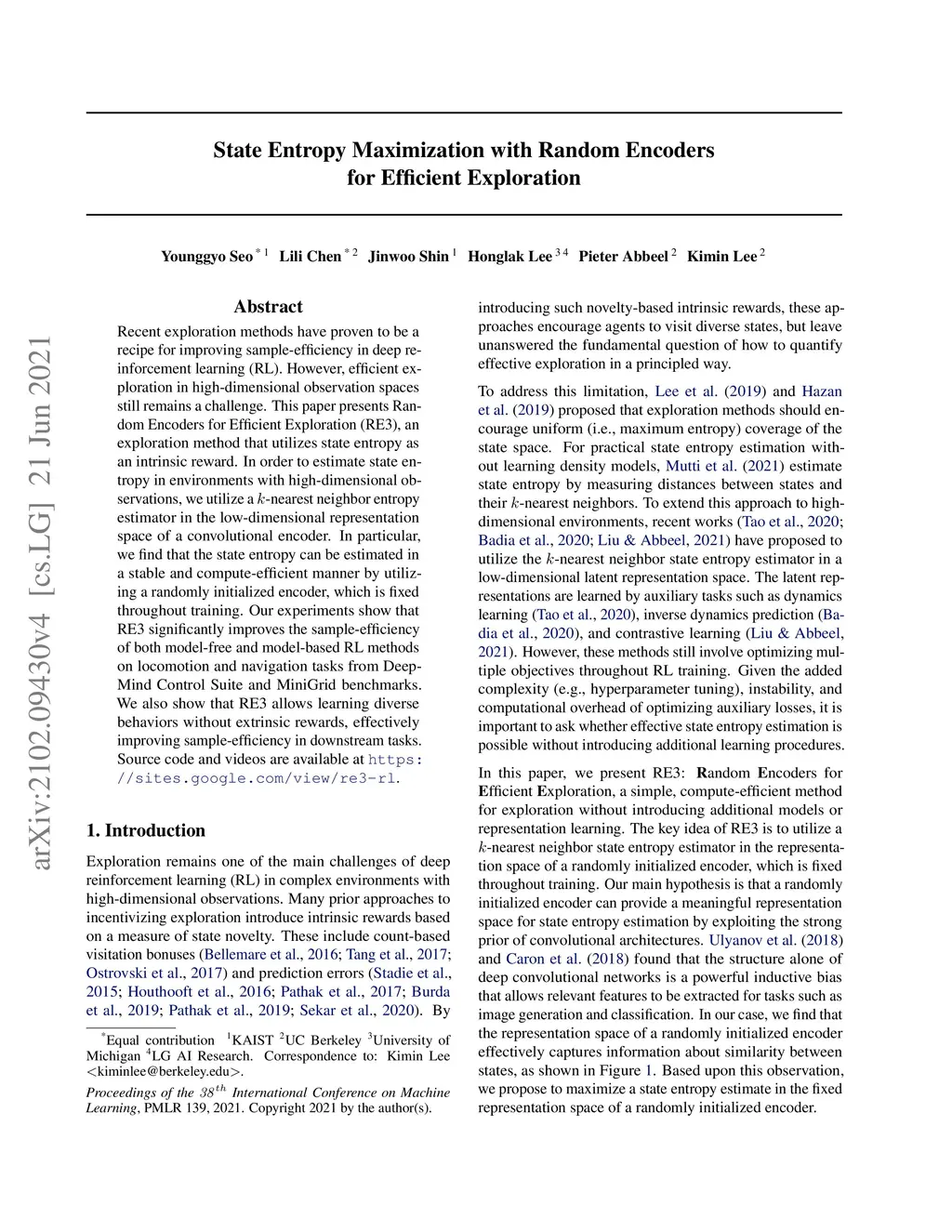 Recent exploration methods have proven to be a recipe for improving sample-efficiency in deep reinforcement learning (RL). However, efficient exploration in high-dimensional observation spaces still remains a challenge. This paper presents Random Encoders for Efficient Exploration (RE3), an exploration method that utilizes state entropy as an intrinsic reward. In order to estimate state entropy in environments with high-dimensional observations, we utilize a k-nearest neighbor entropy estimator in the low-dimensional representation space of a convolutional encoder. In particular, we find that the state entropy can be estimated in a stable and compute-efficient manner by utilizing a randomly initialized encoder, which is fixed throughout training. Our experiments show that RE3 significantly improves the sample-efficiency of both model-free and model-based RL methods on locomotion and navigation tasks from DeepMind Control Suite and MiniGrid benchmarks. We also show that RE3 allows learning diverse behaviors without extrinsic rewards, effectively improving sample-efficiency in downstream tasks. Source code and videos are available at https://sites.google.com/view/re3-rl.