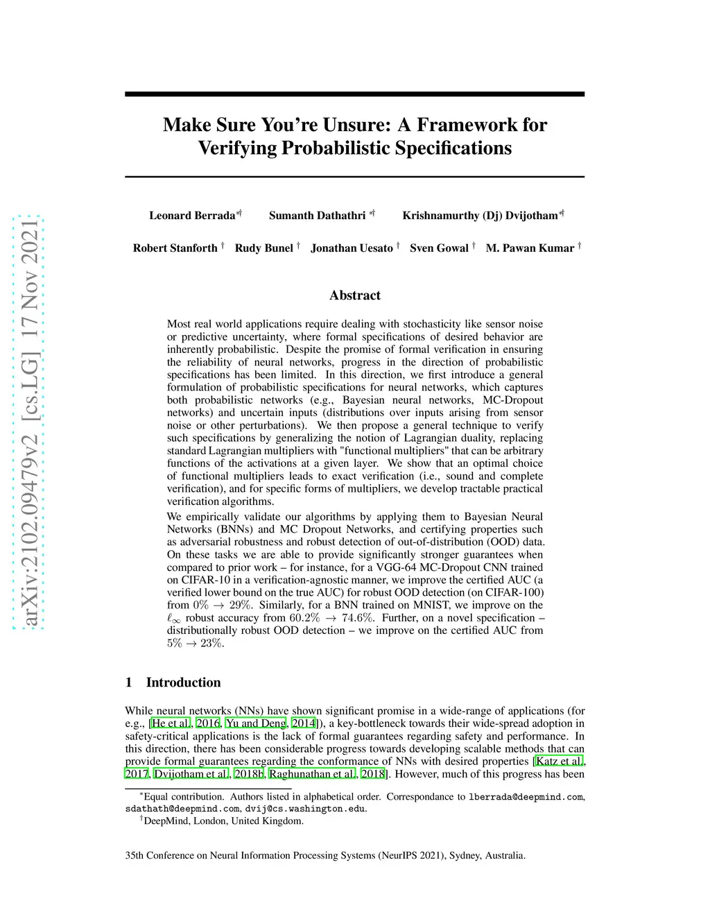 Most real world applications require dealing with stochasticity like sensor noise or predictive uncertainty, where formal specifications of desired behavior are inherently probabilistic. Despite the promise of formal verification in ensuring the reliability of neural networks, progress in the direction of probabilistic specifications has been limited. In this direction, we first introduce a general formulation of probabilistic specifications for neural networks, which captures both probabilistic networks (e.g., Bayesian neural networks, MC-Dropout networks) and uncertain inputs (distributions over inputs arising from sensor noise or other perturbations). We then propose a general technique to verify such specifications by generalizing the notion of Lagrangian duality, replacing standard Lagrangian multipliers with "functional multipliers" that can be arbitrary functions of the activations at a given layer. We show that an optimal choice of functional multipliers leads to exact verification (i.e., sound and complete verification), and for specific forms of multipliers, we develop tractable practical verification algorithms. We empirically validate our algorithms by applying them to Bayesian Neural Networks (BNNs) and MC Dropout Networks, and certifying properties such as adversarial robustness and robust detection of out-of-distribution (OOD) data. On these tasks we are able to provide significantly stronger guarantees when compared to prior work -- for instance, for a VGG-64 MC-Dropout CNN trained on CIFAR-10, we improve the certified AUC (a verified lower bound on the true AUC) for robust OOD detection (on CIFAR-100) from . Similarly, for a BNN trained on MNIST, we improve on the robust accuracy from . Further, on a novel specification -- distributionally robust OOD detection -- we improve the certified AUC from .