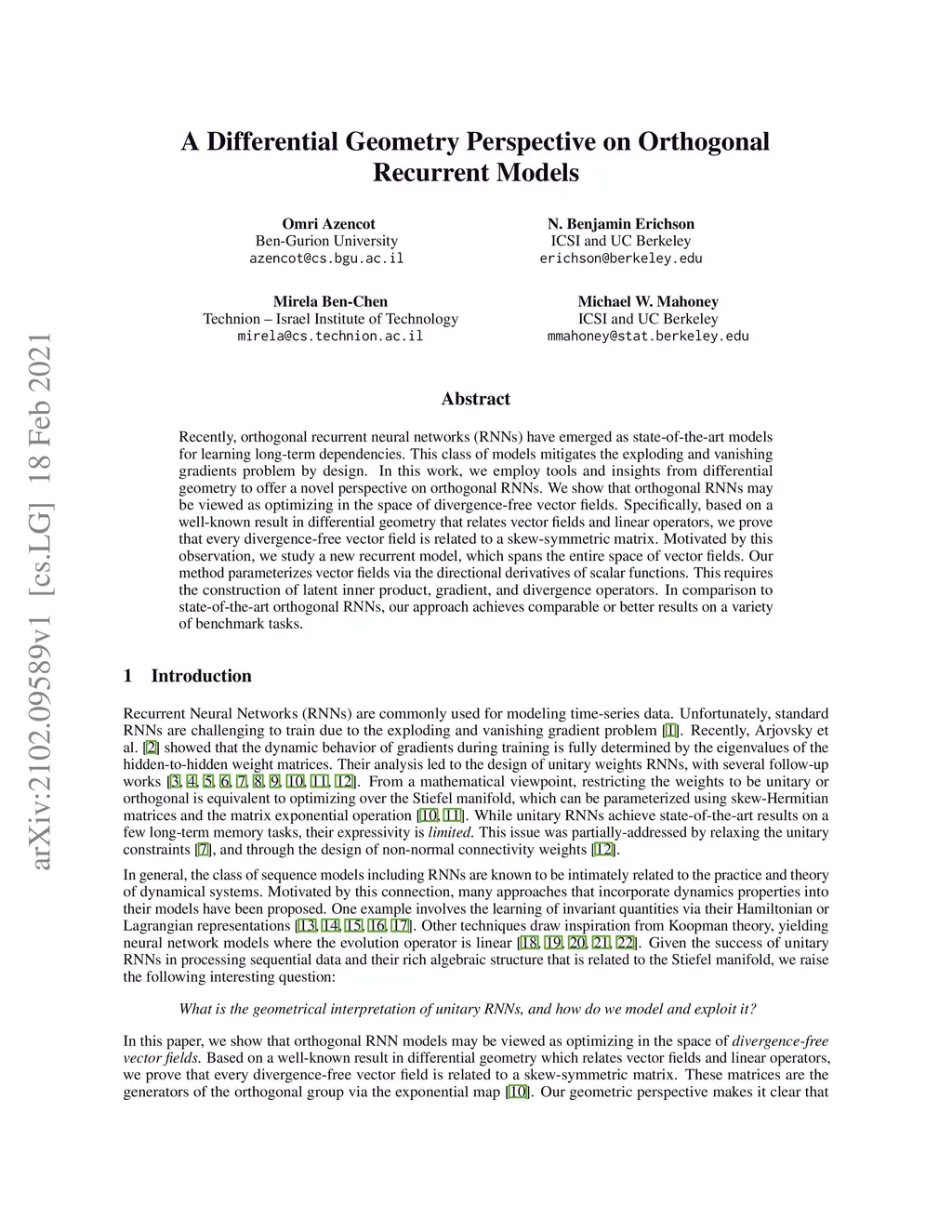 Recently, orthogonal recurrent neural networks (RNNs) have emerged as state-of-the-art models for learning long-term dependencies. This class of models mitigates the exploding and vanishing gradients problem by design. In this work, we employ tools and insights from differential geometry to offer a novel perspective on orthogonal RNNs. We show that orthogonal RNNs may be viewed as optimizing in the space of divergence-free vector fields. Specifically, based on a well-known result in differential geometry that relates vector fields and linear operators, we prove that every divergence-free vector field is related to a skew-symmetric matrix. Motivated by this observation, we study a new recurrent model, which spans the entire space of vector fields. Our method parameterizes vector fields via the directional derivatives of scalar functions. This requires the construction of latent inner product, gradient, and divergence operators. In comparison to state-of-the-art orthogonal RNNs, our approach achieves comparable or better results on a variety of benchmark tasks.