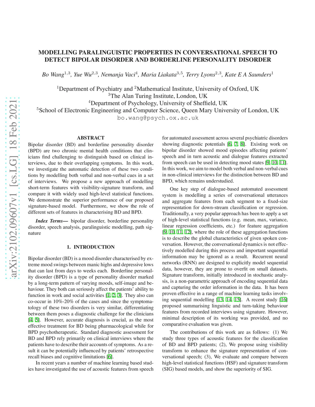 Bipolar disorder (BD) and borderline personality disorder (BPD) are two chronic mental health conditions that clinicians find challenging to distinguish based on clinical interviews, due to their overlapping symptoms. In this work, we investigate the automatic detection of these two conditions by modelling both verbal and non-verbal cues in a set of interviews. We propose a new approach of modelling short-term features with visibility-signature transform, and compare it with widely used high-level statistical functions. We demonstrate the superior performance of our proposed signature-based model. Furthermore, we show the role of different sets of features in characterising BD and BPD.