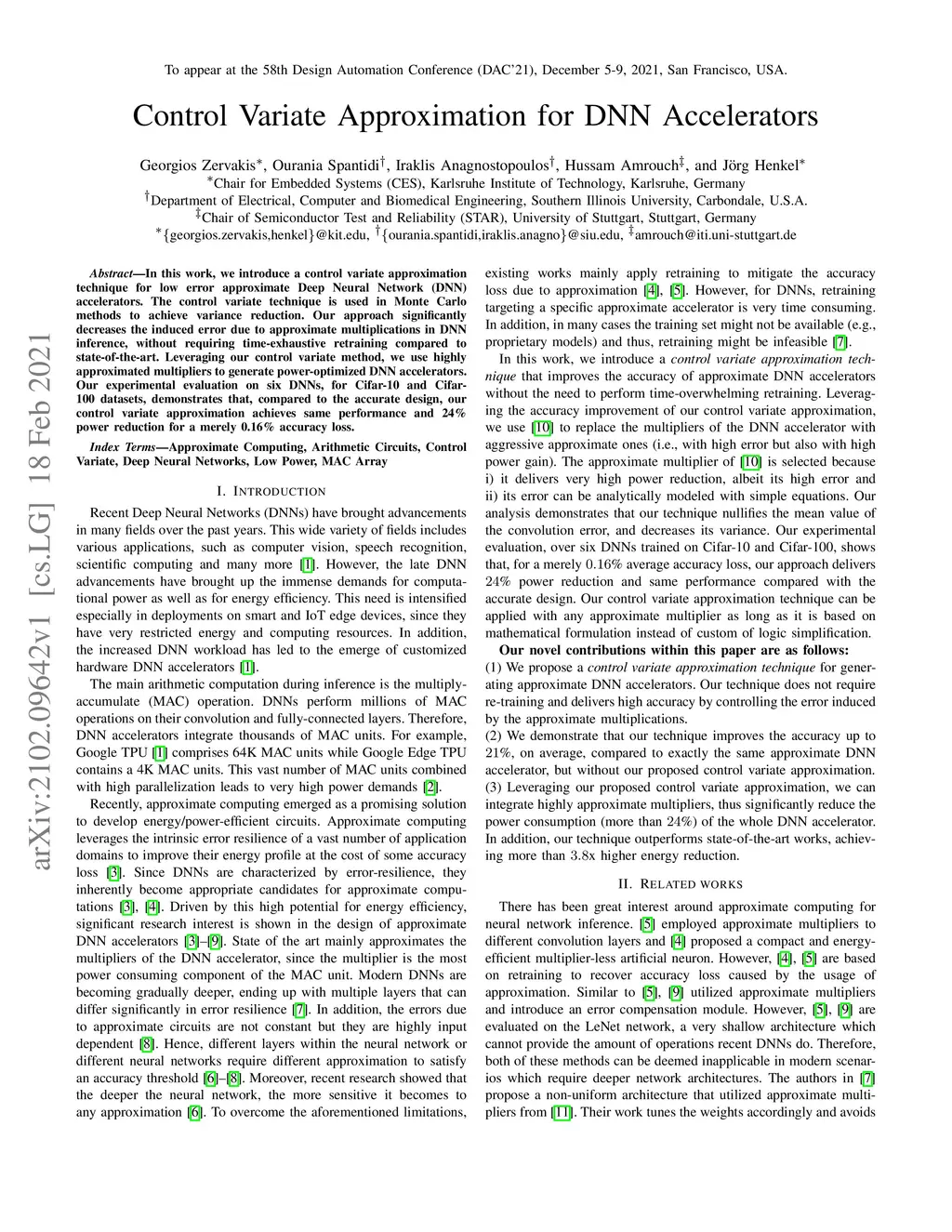 In this work, we introduce a control variate approximation technique for low error approximate Deep Neural Network (DNN) accelerators. The control variate technique is used in Monte Carlo methods to achieve variance reduction. Our approach significantly decreases the induced error due to approximate multiplications in DNN inference, without requiring time-exhaustive retraining compared to state-of-the-art. Leveraging our control variate method, we use highly approximated multipliers to generate power-optimized DNN accelerators. Our experimental evaluation on six DNNs, for Cifar-10 and Cifar-100 datasets, demonstrates that, compared to the accurate design, our control variate approximation achieves same performance and 24% power reduction for a merely 0.16% accuracy loss.