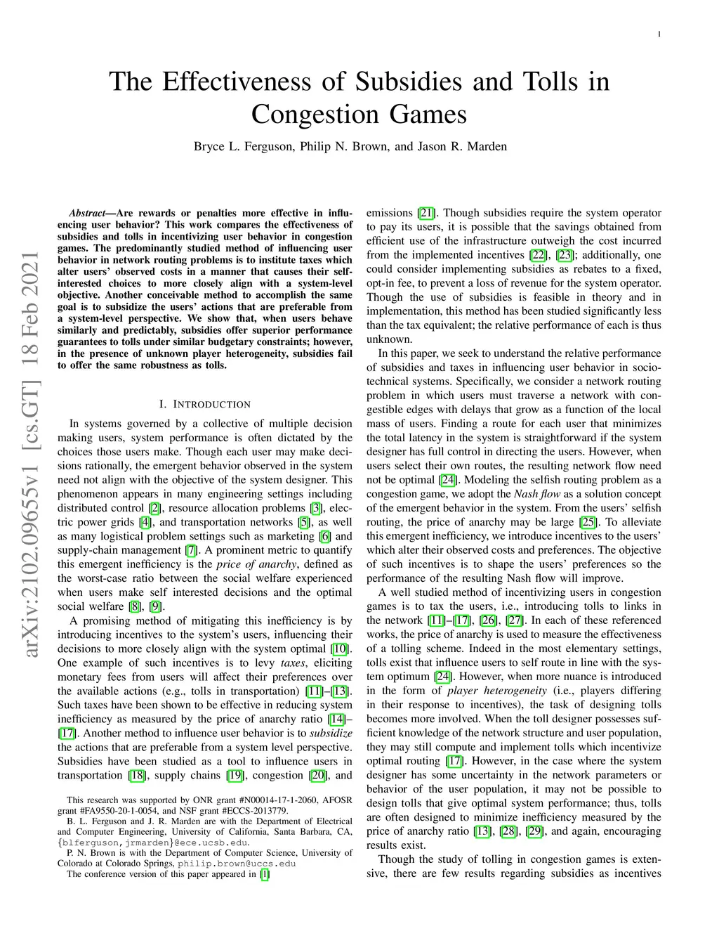 Are rewards or penalties more effective in influencing user behavior? This work compares the effectiveness of subsidies and tolls in incentivizing user behavior in congestion games. The predominantly studied method of influencing user behavior in network routing problems is to institute taxes which alter users' observed costs in a manner that causes their self-interested choices to more closely align with a system-level objective. Another conceivable method to accomplish the same goal is to subsidize the users' actions that are preferable from a system-level perspective. We show that, when users behave similarly and predictably, subsidies offer superior performance guarantees to tolls under similar budgetary constraints; however, in the presence of unknown player heterogeneity, subsidies fail to offer the same robustness as tolls.