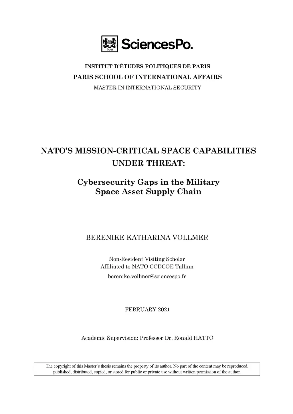 The North Atlantic Treaty Organizations (NATO) public-private Space Asset Supply Chain (SASC) currently exhibits significant cybersecurity gaps. It is well-established that data obtained from space assets is fundamental to NATO, as they allow for the facilitation of its missions, self-defence and effective deterrence of its adversaries. Any hostile cyber operation, suspending control over a space asset, severely impacts both NATO missions and allied Member States national security. This threat is exacerbated by NATOs mostly unregulated cyber SASC. Hence, this thesis answers a twofold research question: a) What are current cybersecurity gaps along NATOs global SASC; and b) How can NATO and its allied Member States gain greater control over such gaps to safeguard the supply of NATO mission-critical information? An ontological field study is carried out by conducting nineteen semi-structured interviews with high-level representatives from relevant public, private and academic organizations. This research was undertaken in collaboration with the NATO Cooperative Cyber Defence Centre of Excellence (CCDCOE) in Tallinn, Estonia. This thesis concludes that current cybersecurity gaps along NATOs SASC are caused by cyber vulnerabilities such as legacy systems or the use of Commercial-Off-the-Shelf (COTS) technology. Inadequate cyber SASC management is caused by hindrances such as misaligned classification levels and significant understaffing. On this basis, NATO should consider two major collaboration initiatives: a) Raising Awareness throughout the whole of the NATO system, and b) Pushing forward the creation of regulation through a standardized security framework on SASC cybersecurity. Doing so would enable NATO and its Member States to recognise cyberthreats to mission-critical data early on along its cyber SASC, and thus increase transparency, responsibility, and liability.