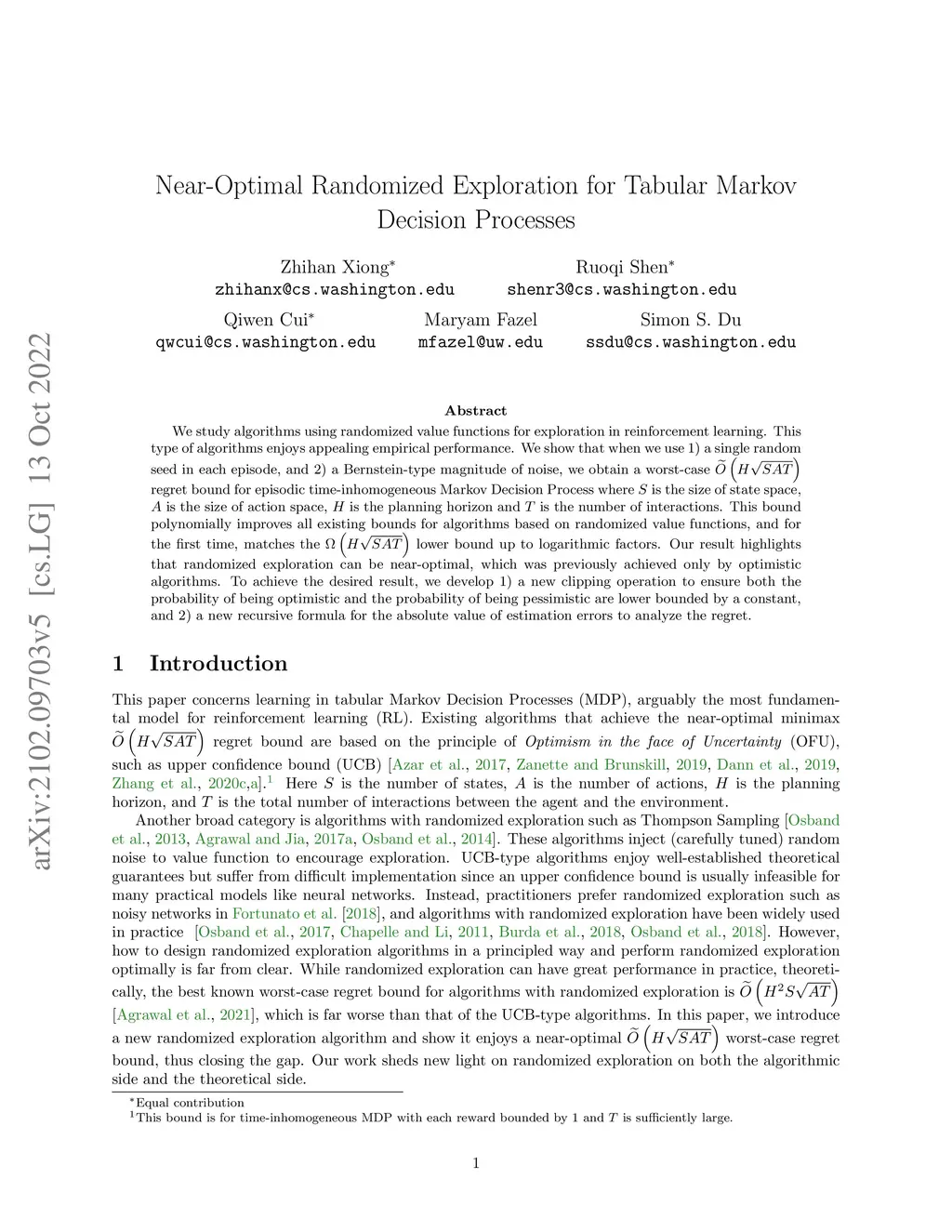 We study algorithms using randomized value functions for exploration in reinforcement learning. This type of algorithms enjoys appealing empirical performance. We show that when we use 1) a single random seed in each episode, and 2) a Bernstein-type magnitude of noise, we obtain a worst-case regret bound for episodic time-inhomogeneous Markov Decision Process where is the size of state space, is the size of action space, is the planning horizon and is the number of interactions. This bound polynomially improves all existing bounds for algorithms based on randomized value functions, and for the first time, matches the lower bound up to logarithmic factors. Our result highlights that randomized exploration can be near-optimal, which was previously achieved only by optimistic algorithms. To achieve the desired result, we develop 1) a new clipping operation to ensure both the probability of being optimistic and the probability of being pessimistic are lower bounded by a constant, and 2) a new recursive formula for the absolute value of estimation errors to analyze the regret.
