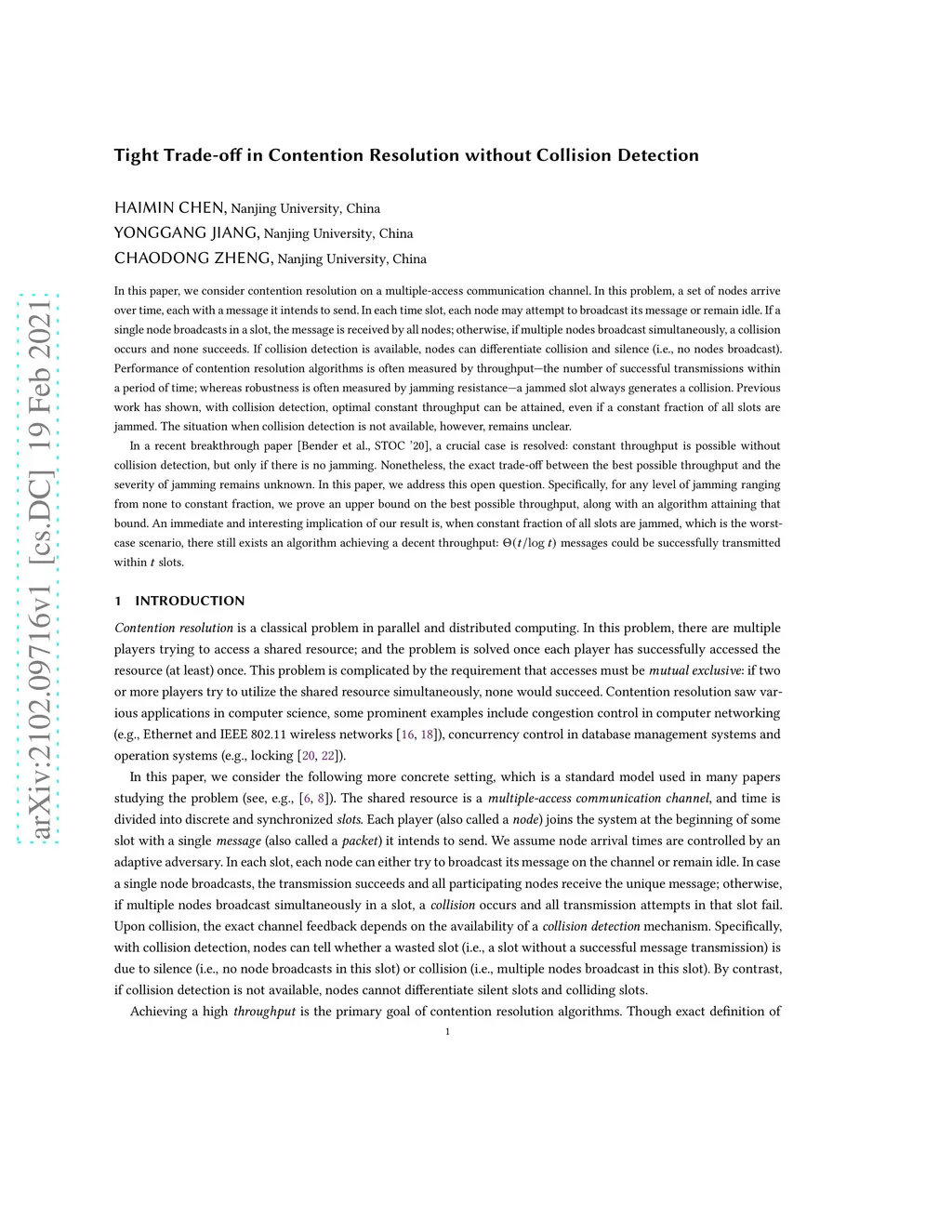 In this paper, we consider contention resolution on a multiple-access communication channel. In this problem, a set of nodes arrive over time, each with a message it intends to send. In each time slot, each node may attempt to broadcast its message or remain idle. If a single node broadcasts in a slot, the message is received by all nodes; otherwise, if multiple nodes broadcast simultaneously, a collision occurs and none succeeds. If collision detection is available, nodes can differentiate collision and silence (i.e., no nodes broadcast). Performance of contention resolution algorithms is often measured by throughput -- the number of successful transmissions within a period of time; whereas robustness is often measured by jamming resistance -- a jammed slot always generates a collision. Previous work has shown, with collision detection, optimal constant throughput can be attained, even if a constant fraction of all slots are jammed. The situation when collision detection is not available, however, remains unclear. In a recent breakthrough paper [Bender et al., STOC '20], a crucial case is resolved: constant throughput is possible without collision detection, but only if there is no jamming. Nonetheless, the exact trade-off between the best possible throughput and the severity of jamming remains unknown. In this paper, we address this open question. Specifically, for any level of jamming ranging from none to constant fraction, we prove an upper bound on the best possible throughput, along with an algorithm attaining that bound. An immediate and interesting implication of our result is, when a constant fraction of all slots are jammed, which is the worst-case scenario, there still exists an algorithm achieving a decent throughput: messages could be successfully transmitted within slots.