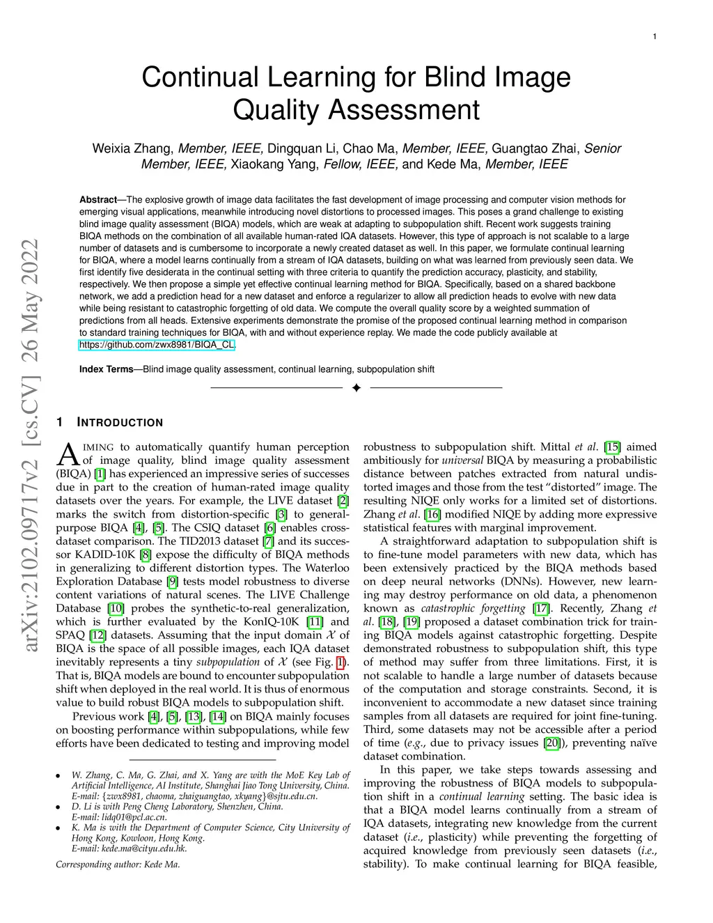 The explosive growth of image data facilitates the fast development of image processing and computer vision methods for emerging visual applications, meanwhile introducing novel distortions to the processed images. This poses a grand challenge to existing blind image quality assessment (BIQA) models, failing to continually adapt to such subpopulation shift. Recent work suggests training BIQA methods on the combination of all available human-rated IQA datasets. However, this type of approach is not scalable to a large number of datasets, and is cumbersome to incorporate a newly created dataset as well. In this paper, we formulate continual learning for BIQA, where a model learns continually from a stream of IQA datasets, building on what was learned from previously seen data. We first identify five desiderata in the new setting with a measure to quantify the plasticity-stability trade-off. We then propose a simple yet effective method for learning BIQA models continually. Specifically, based on a shared backbone network, we add a prediction head for a new dataset, and enforce a regularizer to allow all prediction heads to evolve with new data while being resistant to catastrophic forgetting of old data. We compute the quality score by an adaptive weighted summation of estimates from all prediction heads. Extensive experiments demonstrate the promise of the proposed continual learning method in comparison to standard training techniques for BIQA. We made the code publicly available at https://github.com/zwx8981/BIQA_CL.