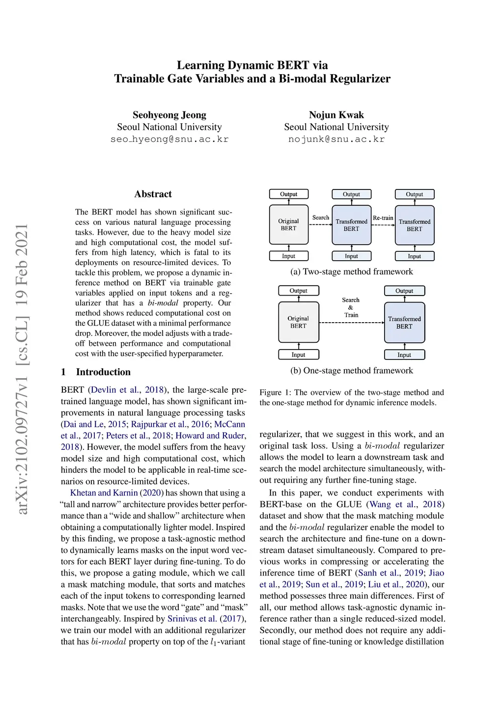 Learning Dynamic BERT via Trainable Gate Variables and a Bi-modal