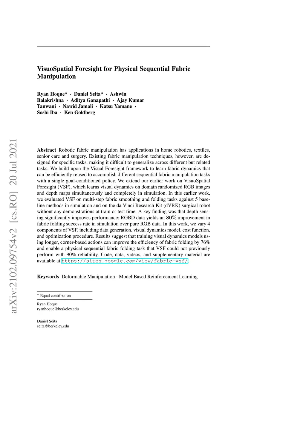 VisuoSpatial Foresight for Physical Sequential Fabric Manipulation