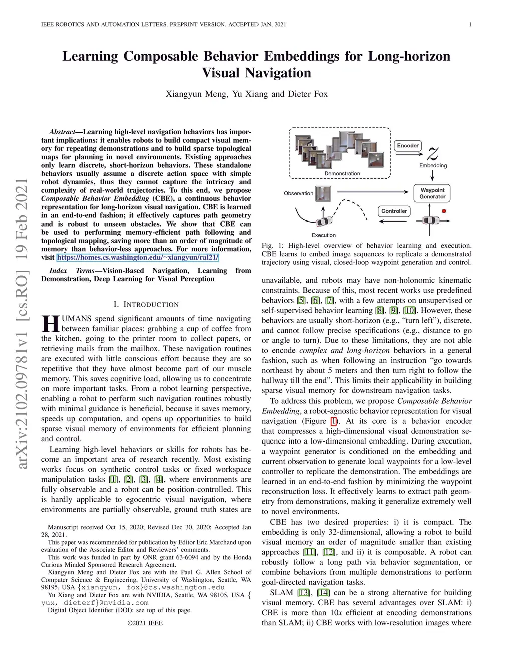 Learning high-level navigation behaviors has important implications: it enables robots to build compact visual memory for repeating demonstrations and to build sparse topological maps for planning in novel environments. Existing approaches only learn discrete, short-horizon behaviors. These standalone behaviors usually assume a discrete action space with simple robot dynamics, thus they cannot capture the intricacy and complexity of real-world trajectories. To this end, we propose Composable Behavior Embedding (CBE), a continuous behavior representation for long-horizon visual navigation. CBE is learned in an end-to-end fashion; it effectively captures path geometry and is robust to unseen obstacles. We show that CBE can be used to performing memory-efficient path following and topological mapping, saving more than an order of magnitude of memory than behavior-less approaches.