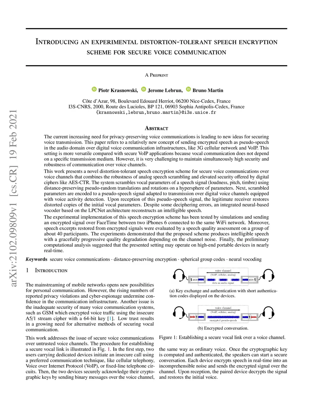 The current increasing need for privacy-preserving voice communications is leading to new ideas for securing voice transmission. This paper refers to a relatively new concept of sending encrypted speech as pseudo-speech in the audio domain over digital voice communication infrastructures, like 3G cellular network and VoIP. This work presents a novel distortion-tolerant speech encryption scheme for secure voice communications over voice channels that combines the robustness of analog speech scrambling and elevated security offered by digital ciphers like AES-CTR. The system scrambles vocal parameters of a speech signal (loudness, pitch, timbre) using distance-preserving pseudo-random translations and rotations on a hypersphere of parameters. Next, scrambled parameters are encoded to a pseudo-speech signal adapted to transmission over digital voice channels equipped with voice activity detection. Upon reception of this pseudo-speech signal, the legitimate receiver restores distorted copies of the initial vocal parameters. Despite some deciphering errors, an integrated neural-based vocoder based on the LPCNet architecture reconstructs an intelligible speech. The experimental implementation of this speech encryption scheme has been tested by simulations and sending an encrypted signal over FaceTime between two iPhones 6 connected to the same WiFi network. Moreover, speech excerpts restored from encrypted signals were evaluated by a speech quality assessment on a group of about 40 participants. The experiments demonstrated that the proposed scheme produces intelligible speech with a gracefully progressive quality degradation depending on the channel noise. Finally, the preliminary computational analysis suggested that the presented setting may operate on high-end portable devices in nearly real-time.