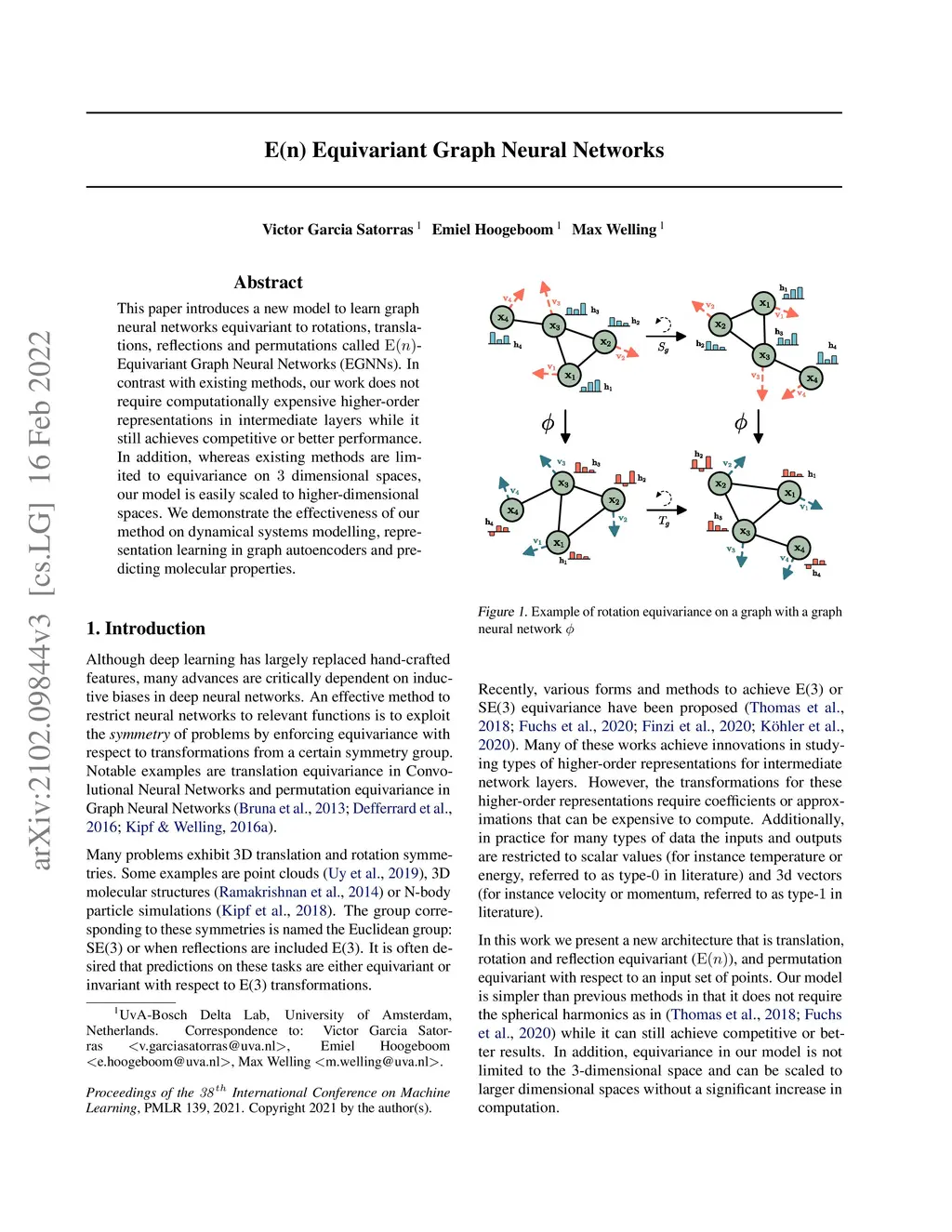 This paper introduces a new model to learn graph neural networks equivariant to rotations, translations, reflections and permutations called E(n)-Equivariant Graph Neural Networks (EGNNs). In contrast with existing methods, our work does not require computationally expensive higher-order representations in intermediate layers while it still achieves competitive or better performance. In addition, whereas existing methods are limited to equivariance on 3 dimensional spaces, our model is easily scaled to higher-dimensional spaces. We demonstrate the effectiveness of our method on dynamical systems modelling, representation learning in graph autoencoders and predicting molecular properties.