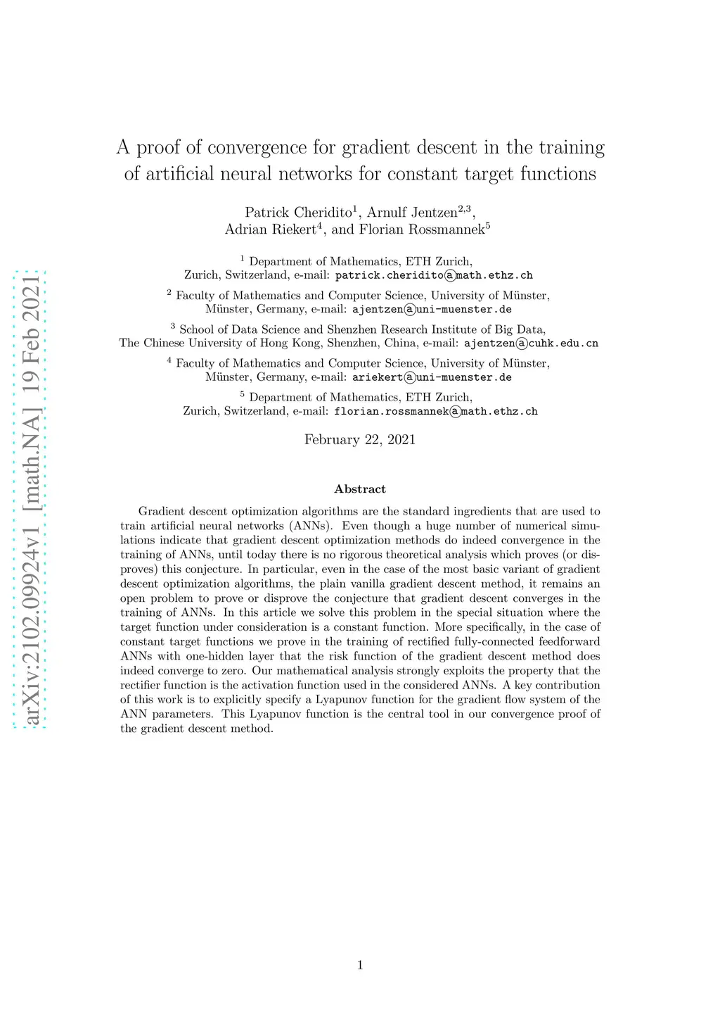 Gradient descent optimization algorithms are the standard ingredients that are used to train artificial neural networks (ANNs). Even though a huge number of numerical simulations indicate that gradient descent optimization methods do indeed convergence in the training of ANNs, until today there is no rigorous theoretical analysis which proves (or disproves) this conjecture. In particular, even in the case of the most basic variant of gradient descent optimization algorithms, the plain vanilla gradient descent method, it remains an open problem to prove or disprove the conjecture that gradient descent converges in the training of ANNs. In this article we solve this problem in the special situation where the target function under consideration is a constant function. More specifically, in the case of constant target functions we prove in the training of rectified fully-connected feedforward ANNs with one-hidden layer that the risk function of the gradient descent method does indeed converge to zero. Our mathematical analysis strongly exploits the property that the rectifier function is the activation function used in the considered ANNs. A key contribution of this work is to explicitly specify a Lyapunov function for the gradient flow system of the ANN parameters. This Lyapunov function is the central tool in our convergence proof of the gradient descent method.