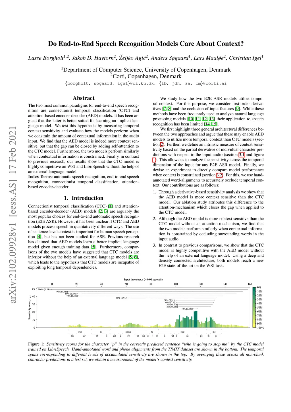 The two most common paradigms for end-to-end speech recognition are connectionist temporal classification (CTC) and attention-based encoder-decoder (AED) models. It has been argued that the latter is better suited for learning an implicit language model. We test this hypothesis by measuring temporal context sensitivity and evaluate how the models perform when we constrain the amount of contextual information in the audio input. We find that the AED model is indeed more context sensitive, but that the gap can be closed by adding self-attention to the CTC model. Furthermore, the two models perform similarly when contextual information is constrained. Finally, in contrast to previous research, our results show that the CTC model is highly competitive on WSJ and LibriSpeech without the help of an external language model.