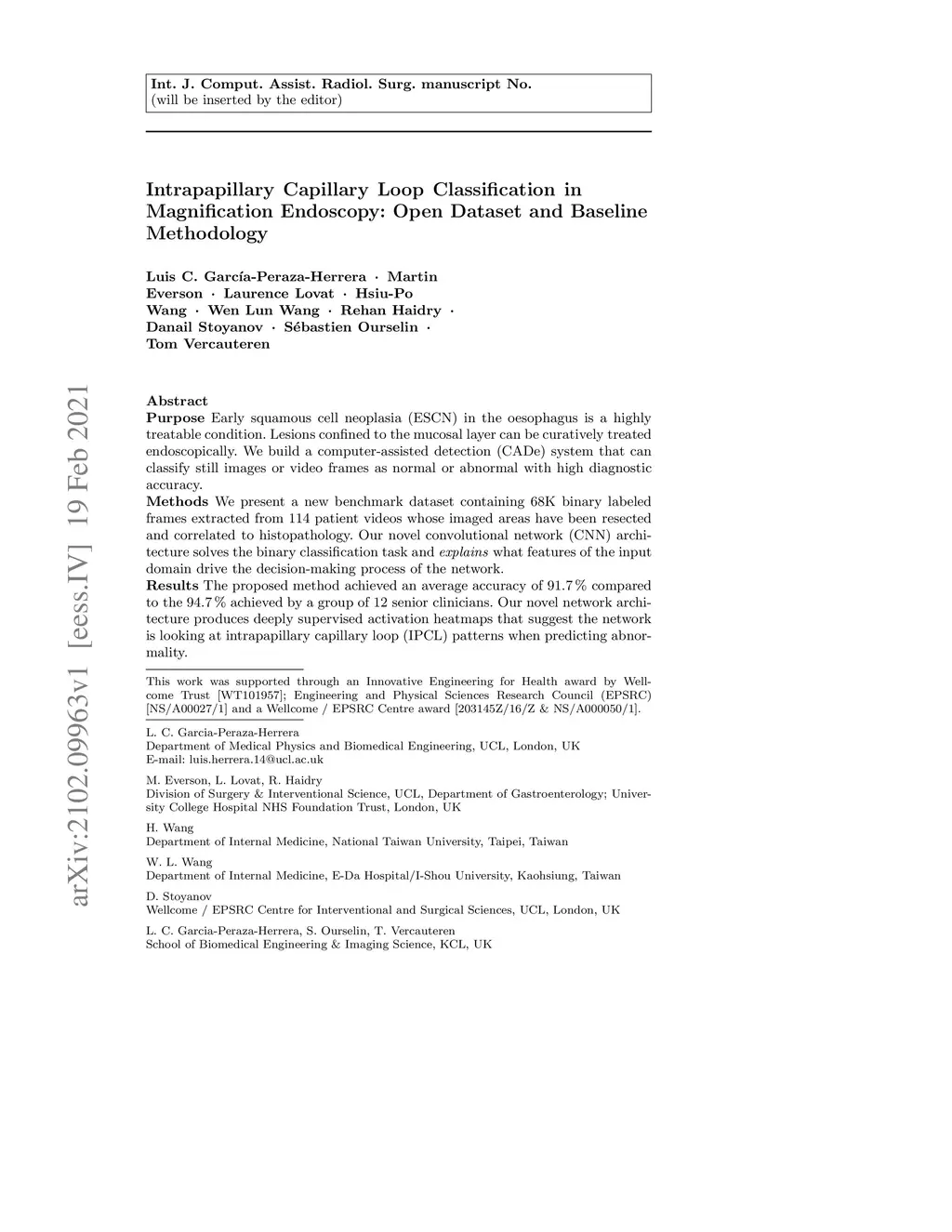 Purpose. Early squamous cell neoplasia (ESCN) in the oesophagus is a highly treatable condition. Lesions confined to the mucosal layer can be curatively treated endoscopically. We build a computer-assisted detection (CADe) system that can classify still images or video frames as normal or abnormal with high diagnostic accuracy. Methods. We present a new benchmark dataset containing 68K binary labeled frames extracted from 114 patient videos whose imaged areas have been resected and correlated to histopathology. Our novel convolutional network (CNN) architecture solves the binary classification task and explains what features of the input domain drive the decision-making process of the network. Results. The proposed method achieved an average accuracy of 91.7 % compared to the 94.7 % achieved by a group of 12 senior clinicians. Our novel network architecture produces deeply supervised activation heatmaps that suggest the network is looking at intrapapillary capillary loop (IPCL) patterns when predicting abnormality. Conclusion. We believe that this dataset and baseline method may serve as a reference for future benchmarks on both video frame classification and explainability in the context of ESCN detection. A future work path of high clinical relevance is the extension of the classification to ESCN types.