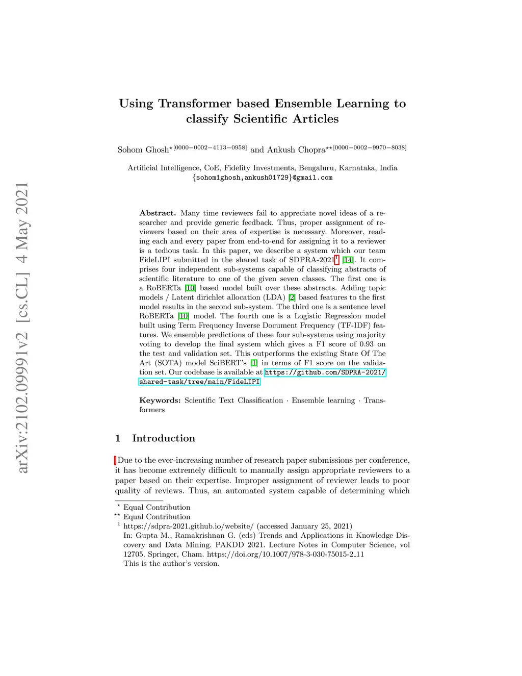 Many time reviewers fail to appreciate novel ideas of a researcher and provide generic feedback. Thus, proper assignment of reviewers based on their area of expertise is necessary. Moreover, reading each and every paper from end-to-end for assigning it to a reviewer is a tedious task. In this paper, we describe a system which our team FideLIPI submitted in the shared task of SDPRA-2021 [14]. It comprises four independent sub-systems capable of classifying abstracts of scientific literature to one of the given seven classes. The first one is a RoBERTa [10] based model built over these abstracts. Adding topic models / Latent dirichlet allocation (LDA) [2] based features to the first model results in the second sub-system. The third one is a sentence level RoBERTa [10] model. The fourth one is a Logistic Regression model built using Term Frequency Inverse Document Frequency (TF-IDF) features. We ensemble predictions of these four sub-systems using majority voting to develop the final system which gives a F1 score of 0.93 on the test and validation set. This outperforms the existing State Of The Art (SOTA) model SciBERT's [1] in terms of F1 score on the validation set.Our codebase is available at https://github.com/SDPRA-2021/shared-task/tree/main/FideLIPI