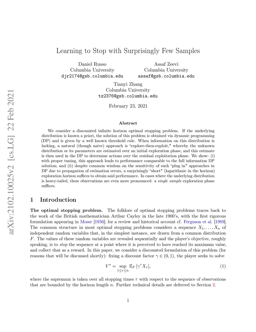 We consider a discounted infinite horizon optimal stopping problem. If the underlying distribution is known a priori, the solution of this problem is obtained via dynamic programming (DP) and is given by a well known threshold rule. When information on this distribution is lacking, a natural (though naive) approach is "explore-then-exploit," whereby the unknown distribution or its parameters are estimated over an initial exploration phase, and this estimate is then used in the DP to determine actions over the residual exploitation phase. We show: (i) with proper tuning, this approach leads to performance comparable to the full information DP solution; and (ii) despite common wisdom on the sensitivity of such "plug in" approaches in DP due to propagation of estimation errors, a surprisingly "short" (logarithmic in the horizon) exploration horizon suffices to obtain said performance. In cases where the underlying distribution is heavy-tailed, these observations are even more pronounced: a exploration phase suffices.