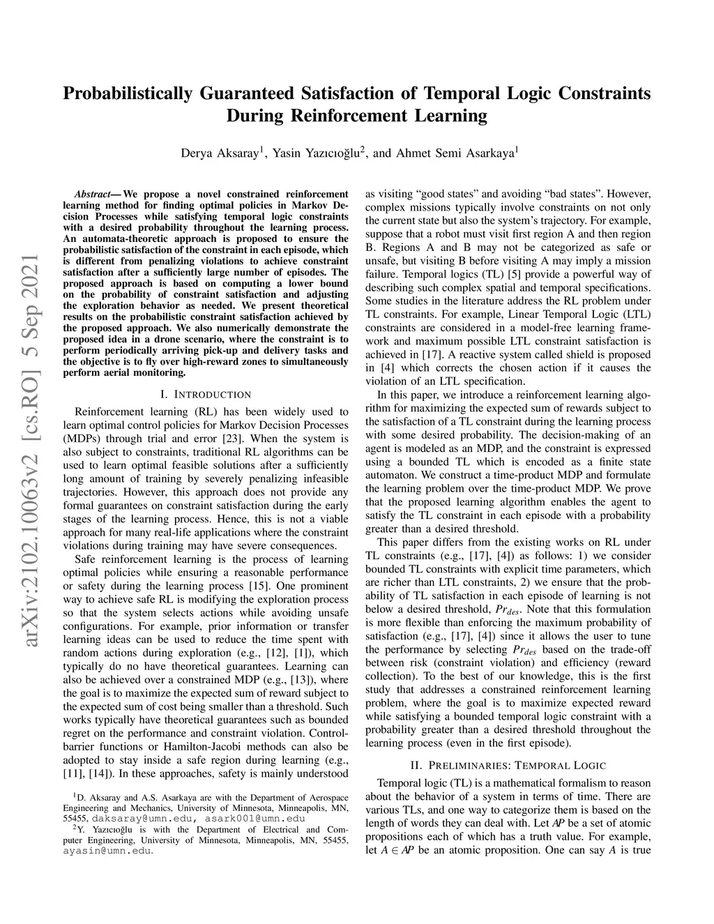 We propose a novel constrained reinforcement learning method for finding optimal policies in Markov Decision Processes while satisfying temporal logic constraints with a desired probability throughout the learning process. An automata-theoretic approach is proposed to ensure the probabilistic satisfaction of the constraint in each episode, which is different from penalizing violations to achieve constraint satisfaction after a sufficiently large number of episodes. The proposed approach is based on computing a lower bound on the probability of constraint satisfaction and adjusting the exploration behavior as needed. We present theoretical results on the probabilistic constraint satisfaction achieved by the proposed approach. We also numerically demonstrate the proposed idea in a drone scenario, where the constraint is to perform periodically arriving pick-up and delivery tasks and the objective is to fly over high-reward zones to simultaneously perform aerial monitoring.