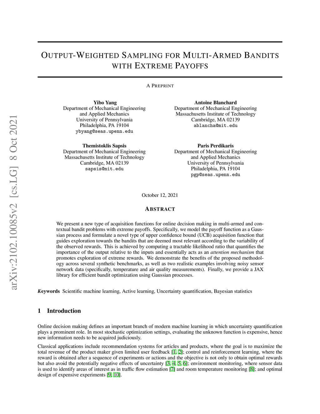 Output-Weighted Sampling for Multi-Armed Bandits with Extreme Payoffs