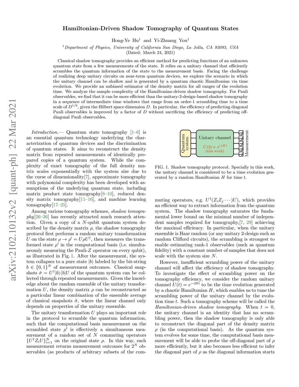 Classical shadow tomography provides an efficient method for predicting functions of an unknown quantum state from a few measurements of the state. It relies on a unitary channel that efficiently scrambles the quantum information of the state to the measurement basis. Facing the challenge of realizing deep unitary circuits on near-term quantum devices, we explore the scenario in which the unitary channel can be shallow and is generated by a quantum chaotic Hamiltonian via time evolution. We provide an unbiased estimator of the density matrix for all ranges of the evolution time. We analyze the sample complexity of the Hamiltonian-driven shadow tomography. For Pauli observables, we find that it can be more efficient than the unitary-2-design-based shadow tomography in a sequence of intermediate time windows that range from an order-1 scrambling time to a time scale of , given the Hilbert space dimension . In particular, the efficiency of predicting diagonal Pauli observables is improved by a factor of without sacrificing the efficiency of predicting off-diagonal Pauli observables.